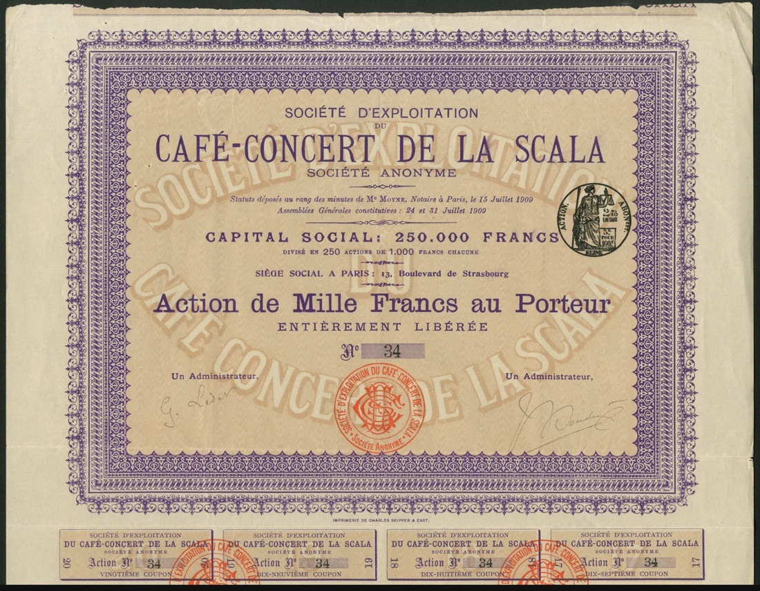 France: Société d'Exploitation du Café-Concert de la Scala, 1000 franc share, 1909, #34, of only 250 issued, ornate border, mauve, yellow underprint, with coupons. Paris Theatre/Music hall built in 1874 on the site of an earlier building. Successful, especially until WWI, seeing many stars performing on stage. Converted to a cinema in 1935. In 1999 it was purchased by a religious cult who wanted it as a meeting place. Planning was refused and the building lay dormant for 16 years then in 2016 irt was purchased by 2 theatre producers who have turned into a 550 seta moduar theatre again. A few edge nicks, otherwise VF and rare.