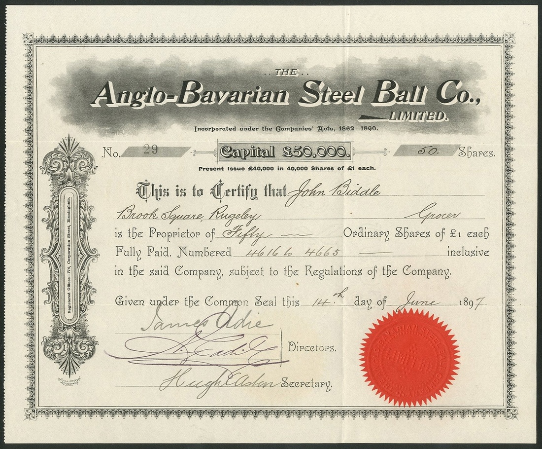 Germany: Anglo-Bavarian Steel Ball Co. Limited, £1 shares, 189[7], #29, ornate border, black, red seal. This Birmingham based company purchased the steel ball bearing company of Fries & Hopflinger in Schweinfurt to supply the booming cycle industry in Europe, There wer 5 such factories in the town but this led to serious overproduction and the company closed in the following year. GVF and rare.