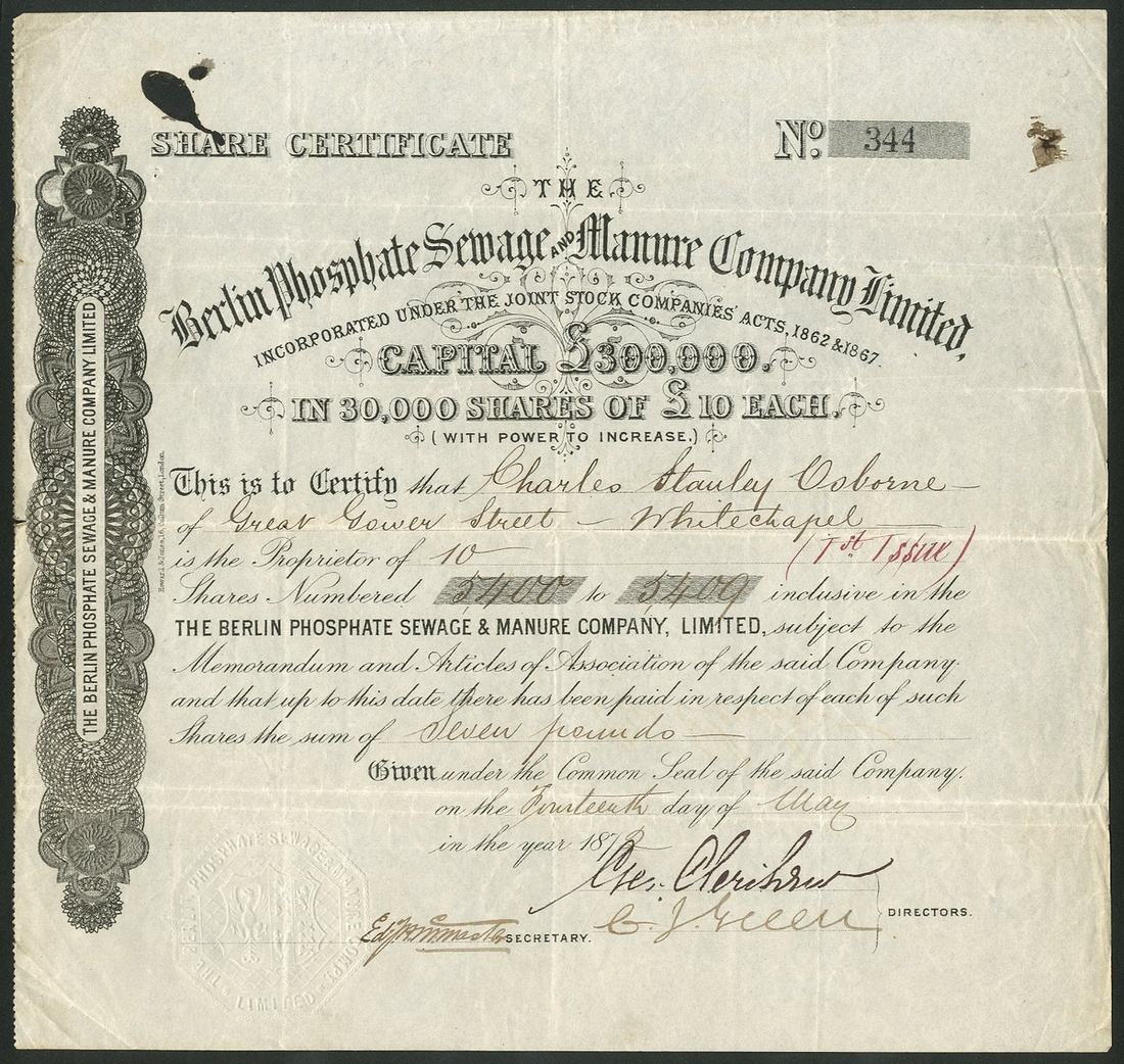 Germany: Berlin Phosphate Sewage and Manure Company Limited, £10 shares, 187[2], #344, scrollwork at left, black. Formed in conjuction with the Phosphate manure Company to acquire land and patents to treat the segage of the City. The board of directors consisted of 4 in London and 4 in Berlin including Dr. Julius Beer who was the Health Officer for the City and H.F.Eckart, Director of Works. Unfortunately the company got into financial difficulties due to the involvement of a Mr. Hartmont, alias Edward Hertzberg, a serial bankrupt leaving a trail of failed companies and loans in his wake. Two small ink stains otherwise F-VF and rare.