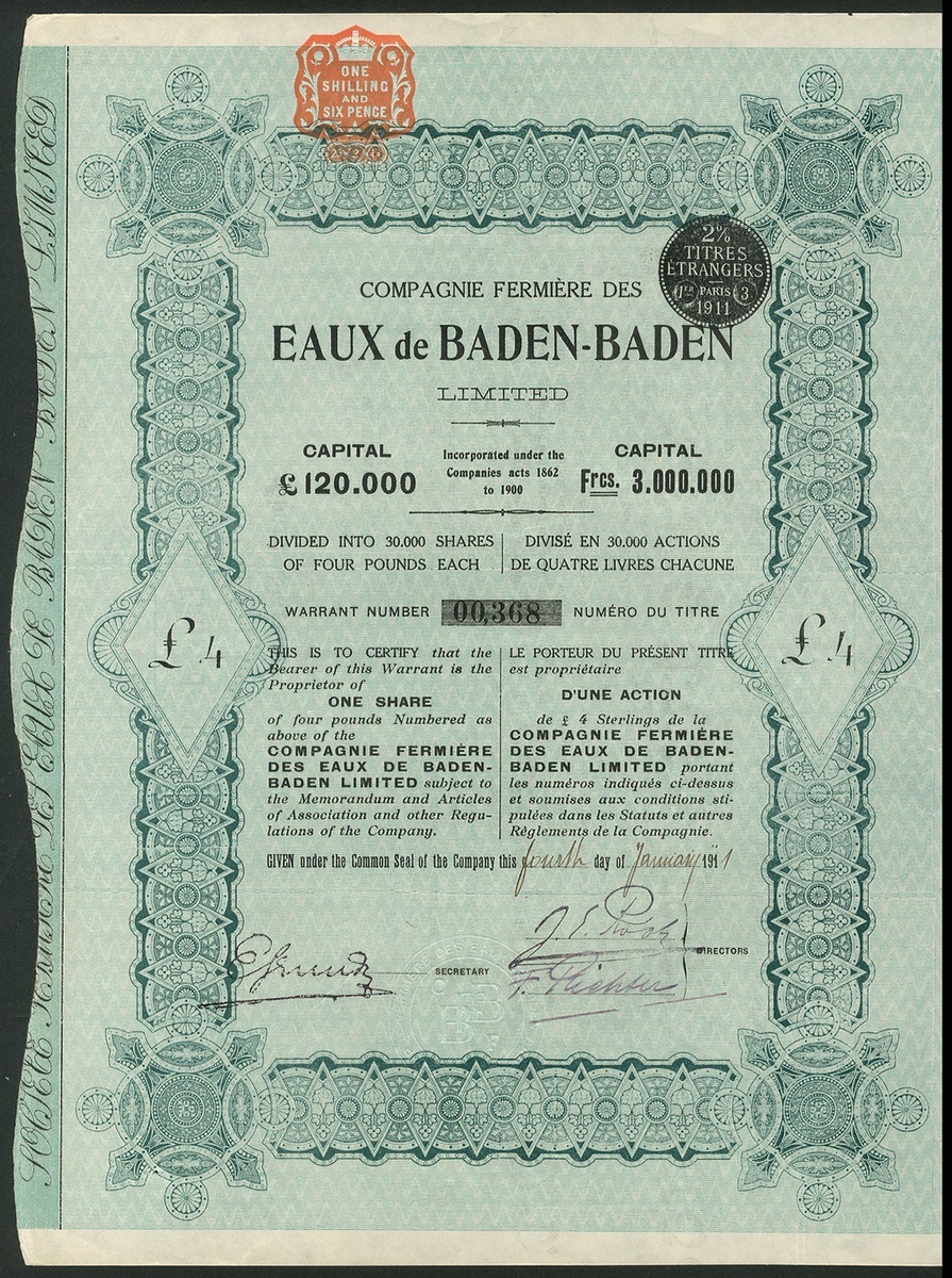 Germany: Cie. Fermiere des Eaux de Baden-Baden Ltd., £4 share, 191[1], #368, ornate border, green with green underprint, with coupons. The hot thermal baths were well known in Roman times but came into their own in modern times at the end of the 18th century. The town became a popular tourist resort with wealthy Europeans especially Russians, French and English, the latter building a golf course and tennis club in the town. Frenchman Jacques Bénazet, nicknamed 'King of Baden' built the world renowned Casino. This English company owned the Friedrich baths presumably until the onset of WWI when it was seized as Enemy property. AEF.