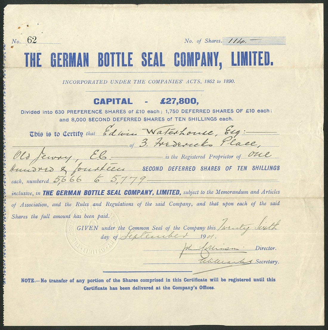 Germany: German Bottle Seal Company Limited, 10 shilling deferred shares, 19[01], #62, blue, embossed seal depicts the company bottle stopper. VF and scarce.