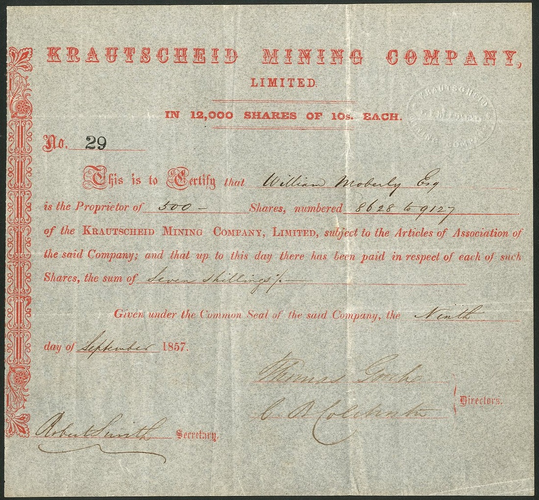 Germany: Krautscheid Mining Co. Ltd., 10 shilling shares, part paid, 1857, #29, signed by Thomas Gooch as director, red. Mine near Würzburg, Southern Germany. Thomas Longridge Gooch (1808 -1882), civil and railway engineer . Brother of Sir Daniel Gooch. Apprenticed to George Stephenson in Newcastle at an early age. Engineer to the Manchester & Leeds Railway until 1844. VF and rare.
