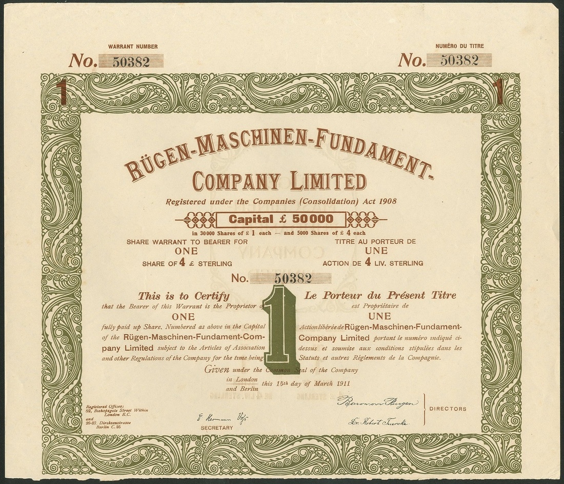Germany: Rügen-Maschinen-Fundament Co. Ltd., £4 share, London/Berlin 1911, #50382, facsimile signature of Baron von Rügen, ornate border, green and brown, no coupons remain. Baron von Rügen patented a rubber sheet to be used under machines to avoid the need for them to be fixed and to supress vibration. EF.