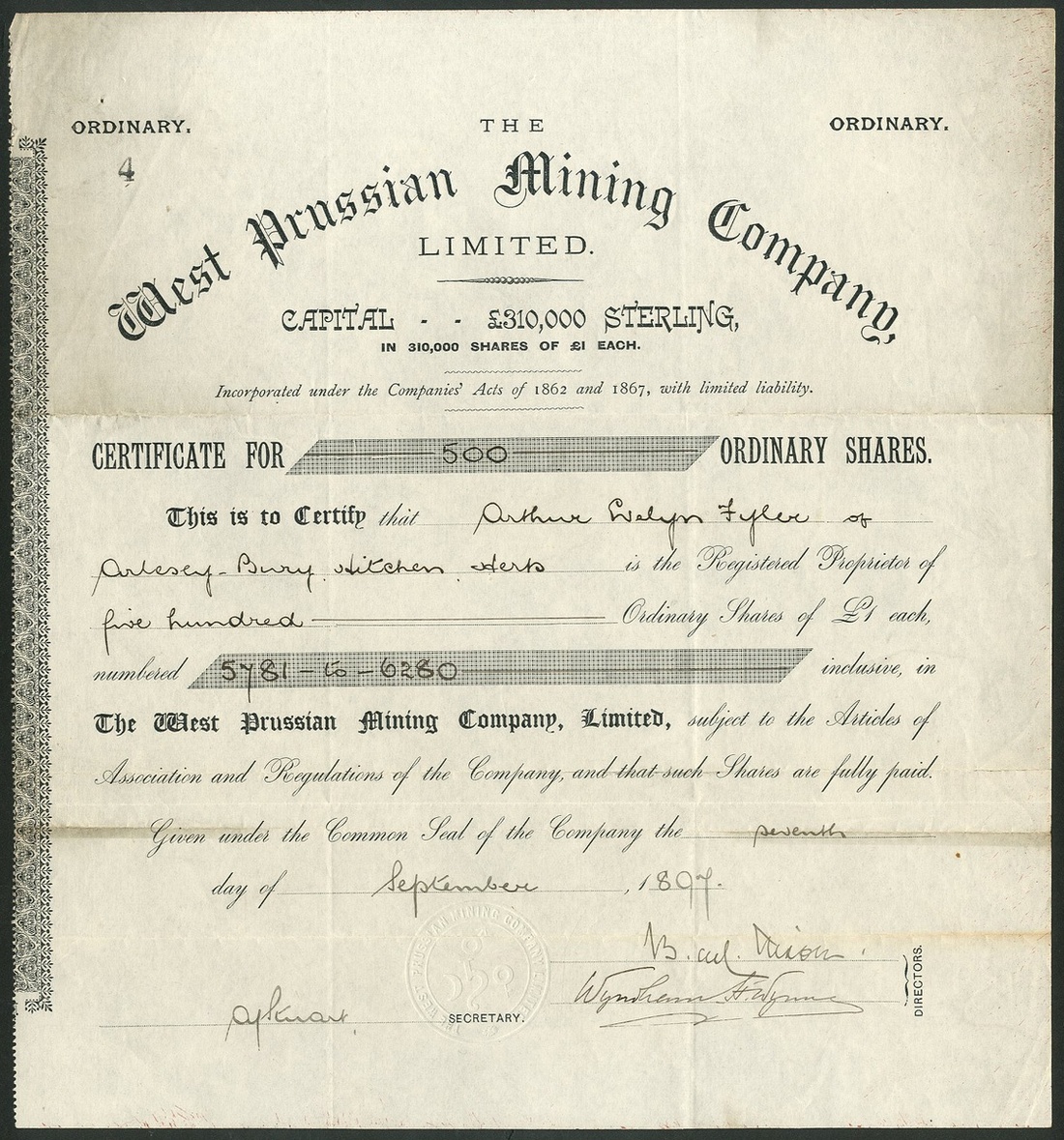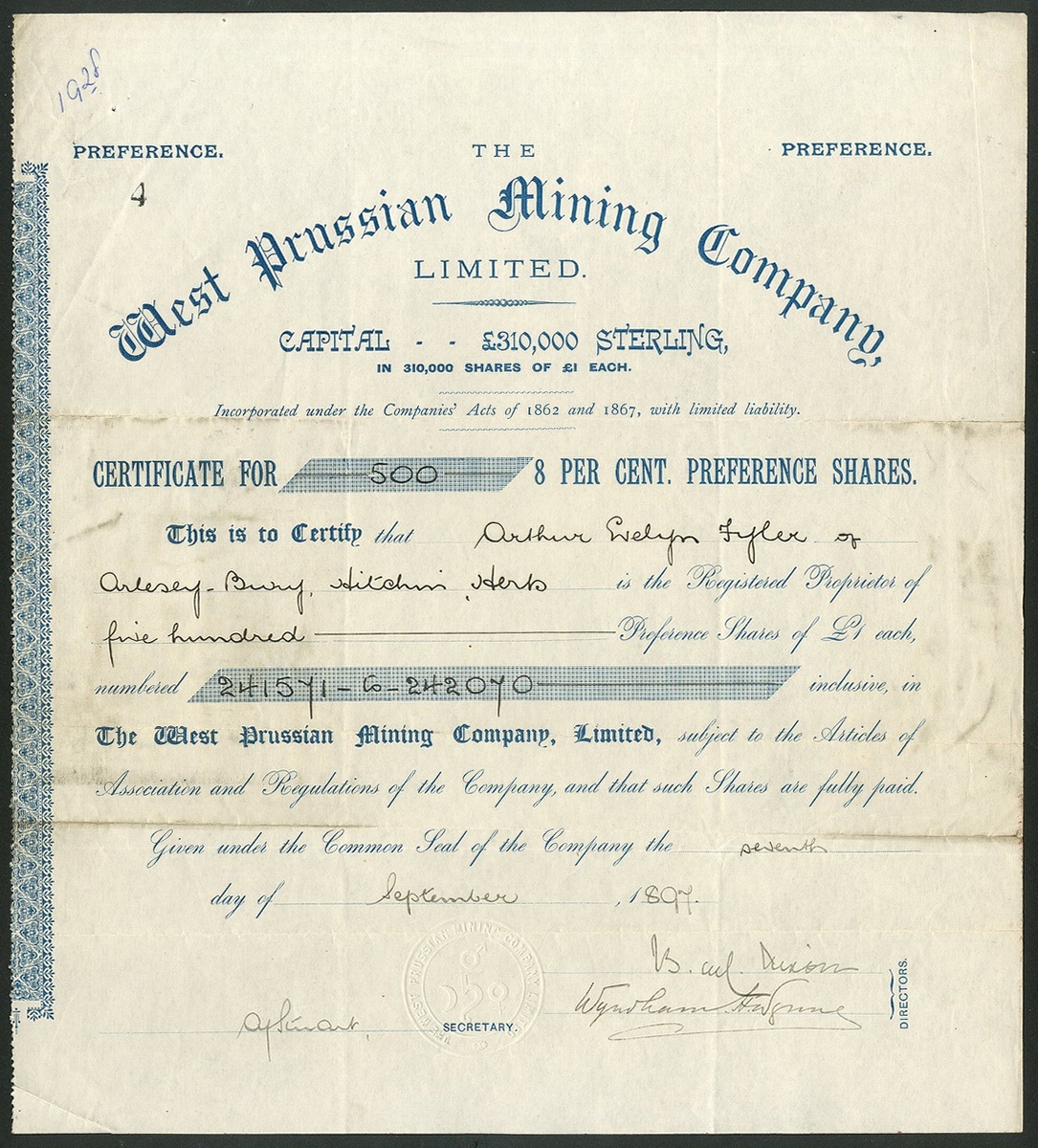 Germany: West Prussian Mining Co. Ltd., pair of certificates for £1 ordinary shares, and 8% preference shares, both 1[897], both #4, siged by Wyndham H. Wynne and Brinsley de Courcy Nixon as directors, black and blue respectively. Registered in 1875 to acquire the mines of the Westphalian and HeidelbergSilver-Lead Mining Companies in Westphalia and Anhalt, some 23,500 acres. Brinsley de Courcy Nixon (1825-1903), banker, founder of the London & Provincial bank and financier of John Hughes in Russia. Wyndham Wynne (1840-1910), mining engineer, and his family had considerable mining interests in Germany. Died in Cologne in 1910. VF and rare (2).