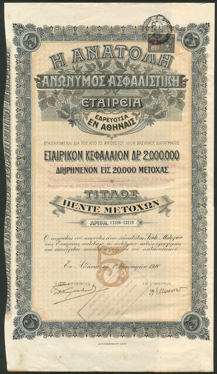 Greece: Eastern Insurance Company, 5 shares, 1910, #13106-13110, large format piece, all in Greek, foliage around title, yellow and black, brown underprint '5', with coupons. Capital reduced in 1914, then doubled a few years later. Although 20,000 shares were issued we have seen denominations of 1, 5 and 50 shares making all of them quite scarce. See previous lot. GVF.