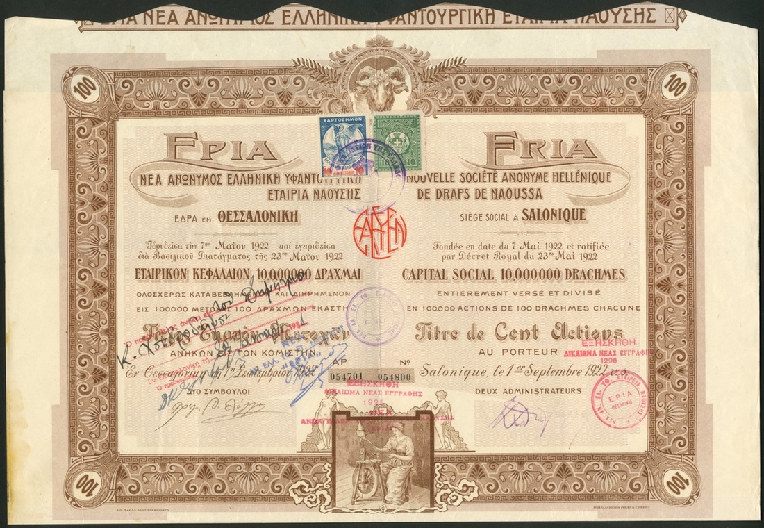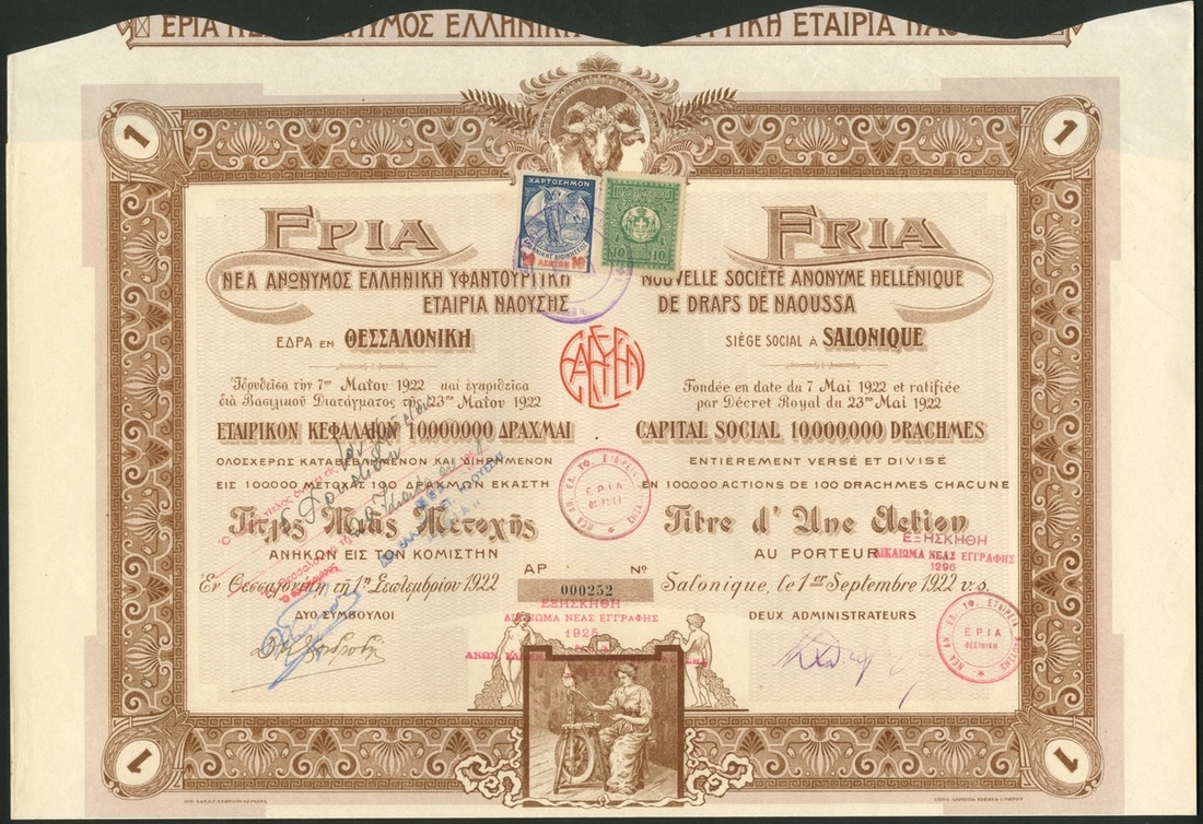 Greece: ERIA Nouvelle Société Anonyme Hellénique de Draps de Naoussa, Salonique, certificates for 1 share, #000252 and 100 shares, #054701-054800 of 100 drachma, 1922, capital 10,000,000 drachma, attractive pieces with vignette of woman at spinning wheel, ornate border, brown, adhesive duty stamps, with coupons. Probably less than 500 of the 100 share certificate issued. VF - EF (2).