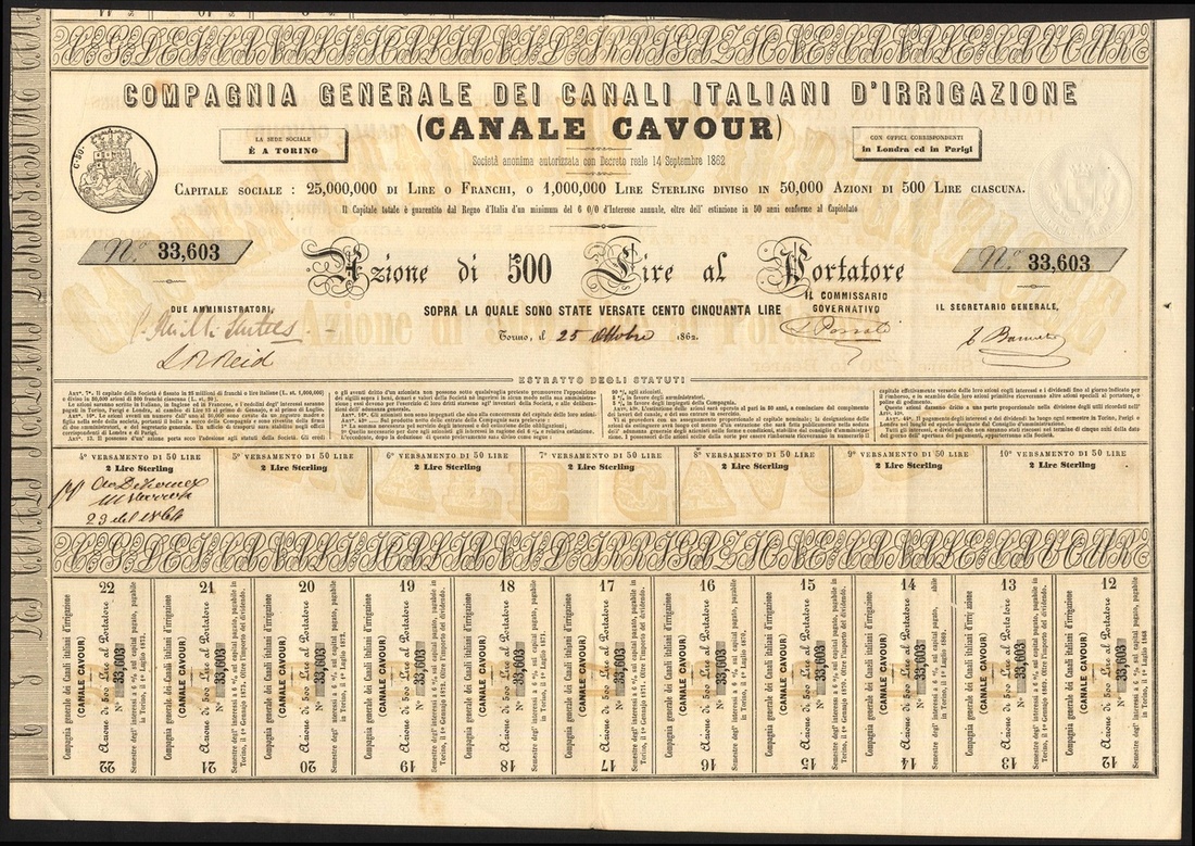 Italy: Canal Cavour - Compagnia Generale dei Canali Italiani d'Irrigazione, 500 lire share, 1862, 12 examples, attractive printing, black with yellow-brown underprint, with coupons. The canal was named after Count Camillo Benso di Cavour, prime minister of Piedmont, and was instigated to irrigate the dry areas of the State, mainly for rice production. It starts at Chivasso, taking water from the Po running 82 km to the Ticino at Galliate. A brilliant feat of engineering, the costs bankrupted the company in 1868 and has been managed by the State since 1874. Centre fold otherwise EF (12).
