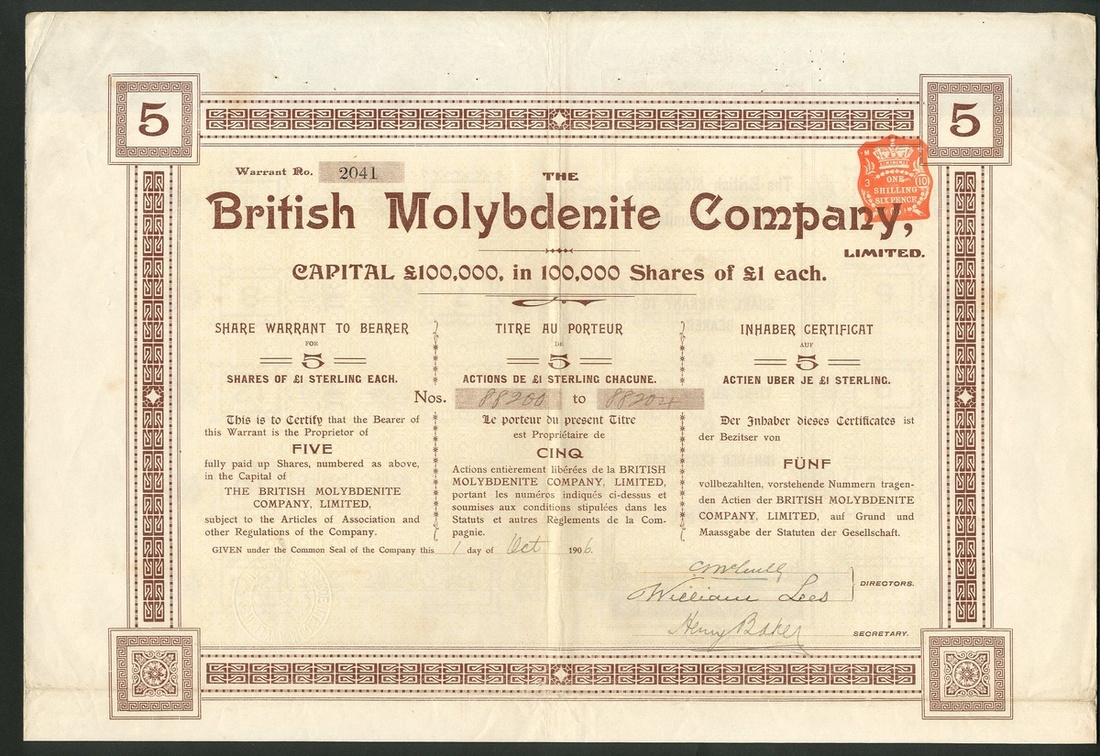Norway: British Molybdenite Company Limited, 5 shares of £1, 190[6], #2041, ornate border, text in English and French, brown, with coupons. Formed to acquire 25 mining claims in the district of Stedevidner, Norway. Molybdenite is the main source of trhe element Molybdenum whose main uses were for battery electrodes and as an alloy with iron for the production of steel. VF.