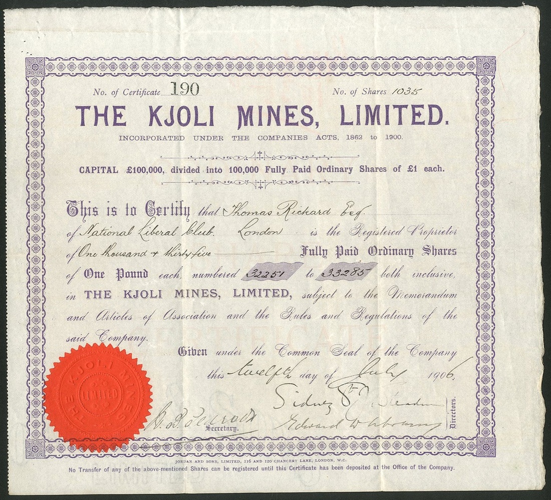 Norway: Kjoli Mines Limited, £1 ordinary shares, 190[6], #190, mauve with red seal. Registered in 1903 to acquire the Kjoli copper ad pyrites mines at Aalen, Guldalen, Norway and also an option over the Gronskar mines in the same region. Kjoli has been worked for copper in the 18th century and from 1857 to 1868 whilst pyrites have been exported until 1920.GVF and scarce.