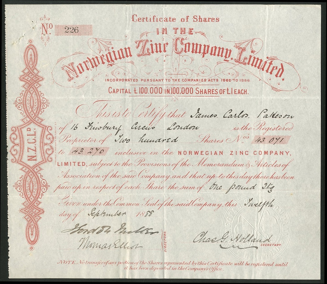 Norway: Norwegian Zinc Co. Ltd., £1 shares, 18[88], #226, scrollwork left, red. An English copany that owned the mines at Odda until 1894. VF.
