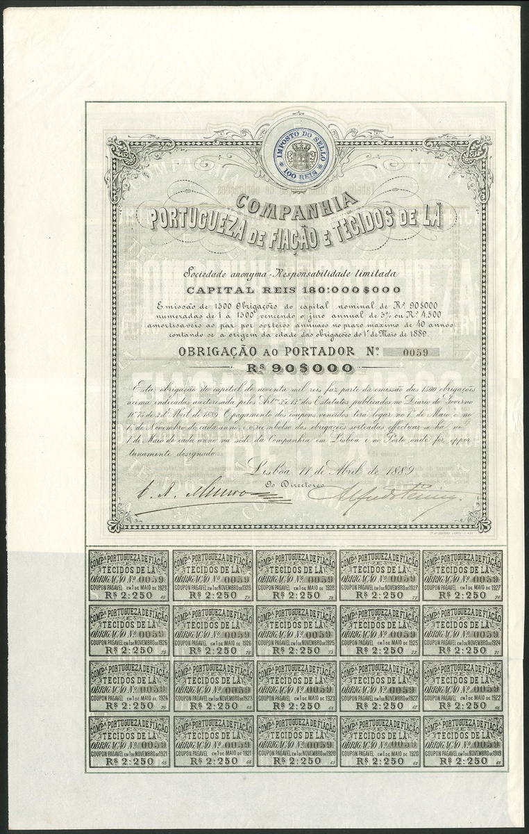 Portugal: Companhia Portugueza de Fiação e Tecidos de Lã, 5% bond for 90 milreis, Lisbon 1889, #0059 of only 1500 issued, grey and black, with coupons. Wool spinning was one of staple industries of Portugal from medieval times centred in the centre of the country. Although it declined in the early 20th century with alternative materials it has grown again in recent years. EF.