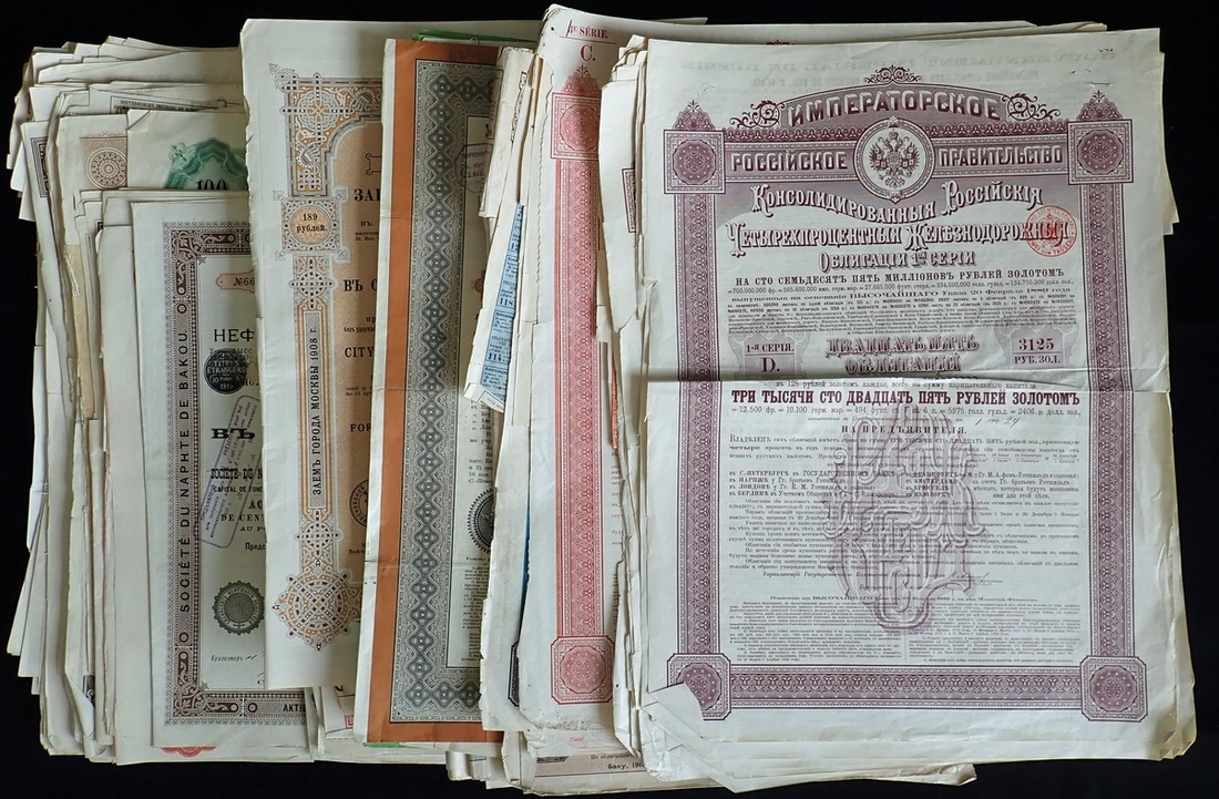 Russia: 1889 Consolidated 4% Railroad Bonds, series 1, bonds for 3125 roubles, 5 examples, mauve, 2 without coupons; together with a large quantity of other Russian bonds, some duplication, including a quantity of bonds of the City of Moscow Loan, 1908, £20 and £100. Good variety. Many VF and better (140).
