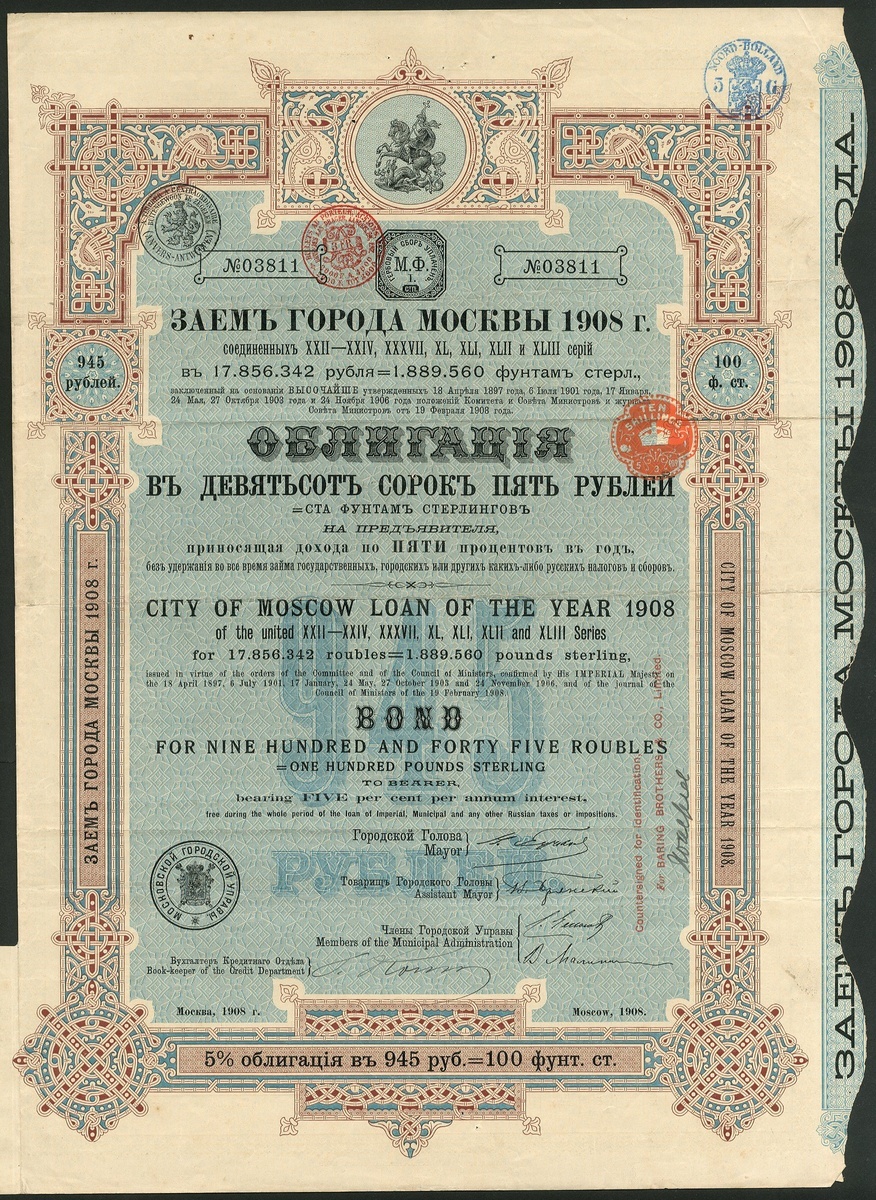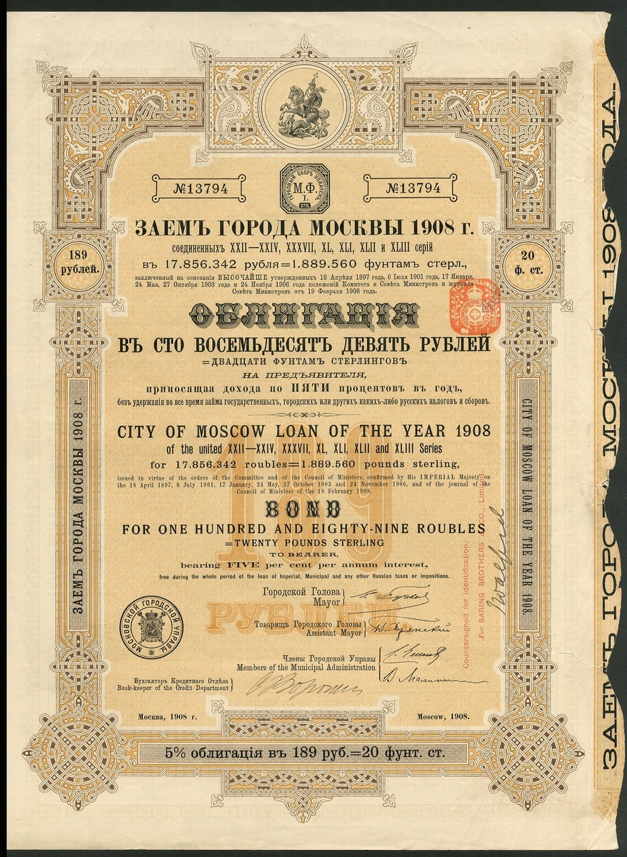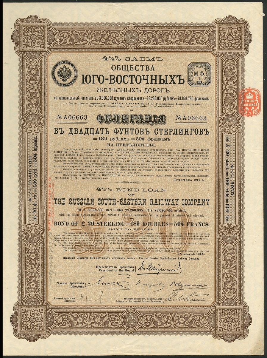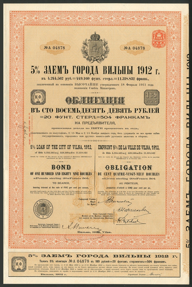Russia: City of Vilna, 5% Loan, 1912, bond for £20, #4878, large format, coat of arms at top, ornate border, red and black with yellow underprint, with coupons. Together with Moscow 1908, £20 and £100 and Russian South Eastern Railway, £20 bonds. The first EF, the rest VF and better (4).