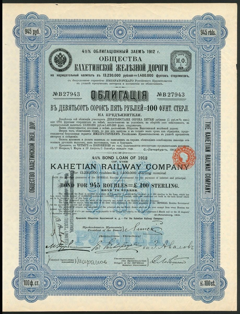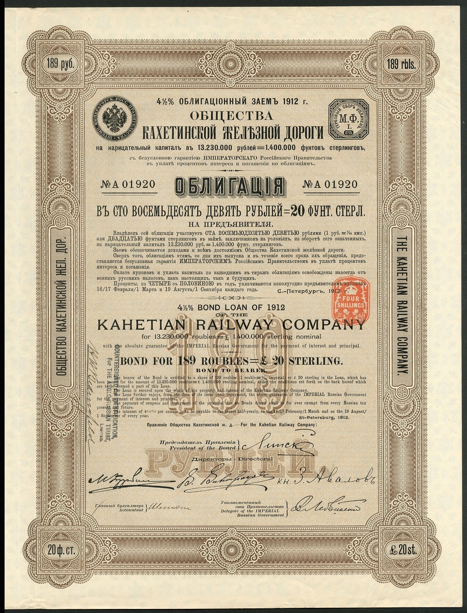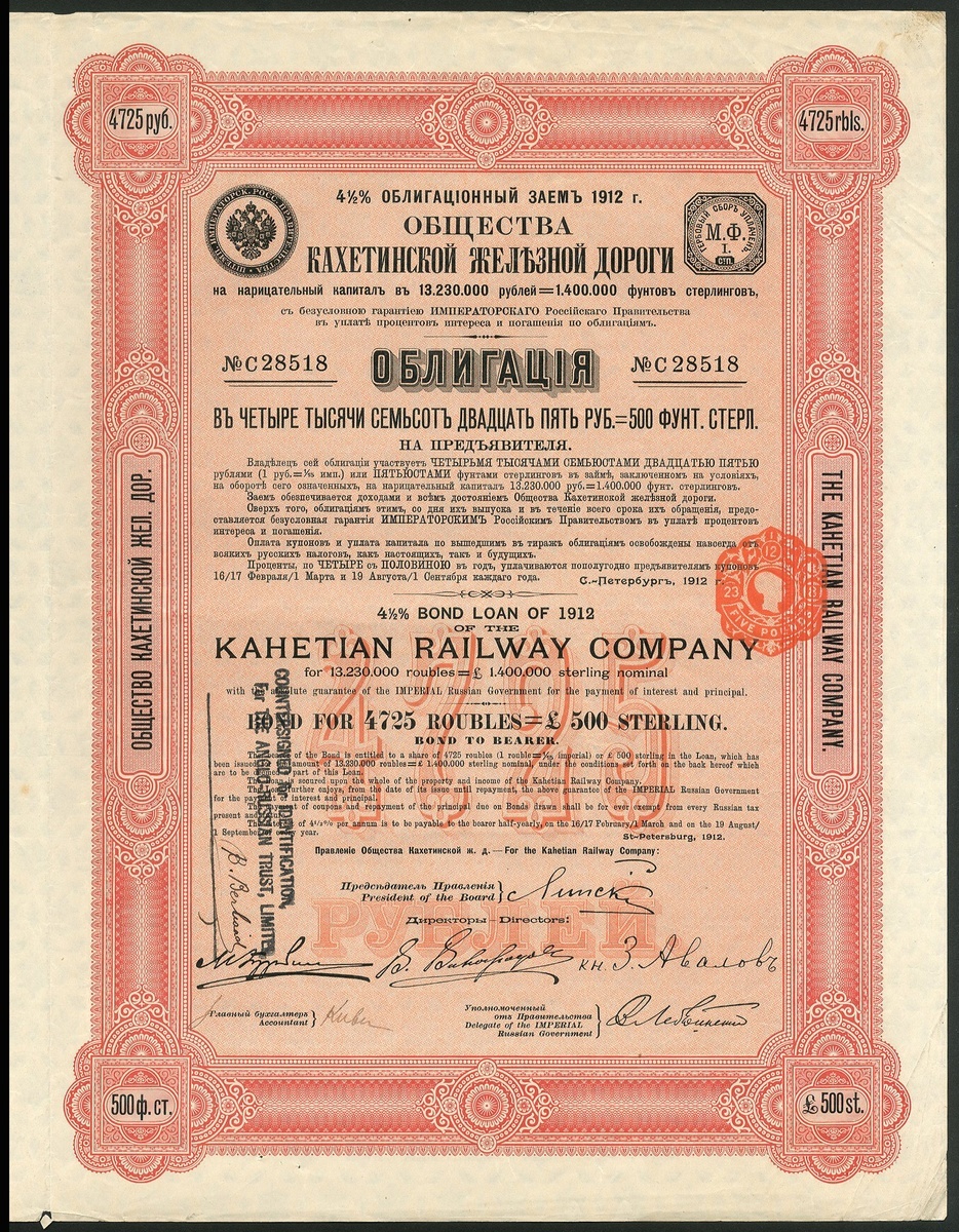 Russia: Kahetian Railway Company, 4½% Loan 1912, set of bonds for £20, brown, £100, blue and £500, red, ONLY 300 issued, all with coupons. The £100 with a couple of edge nicks, VF (3).
