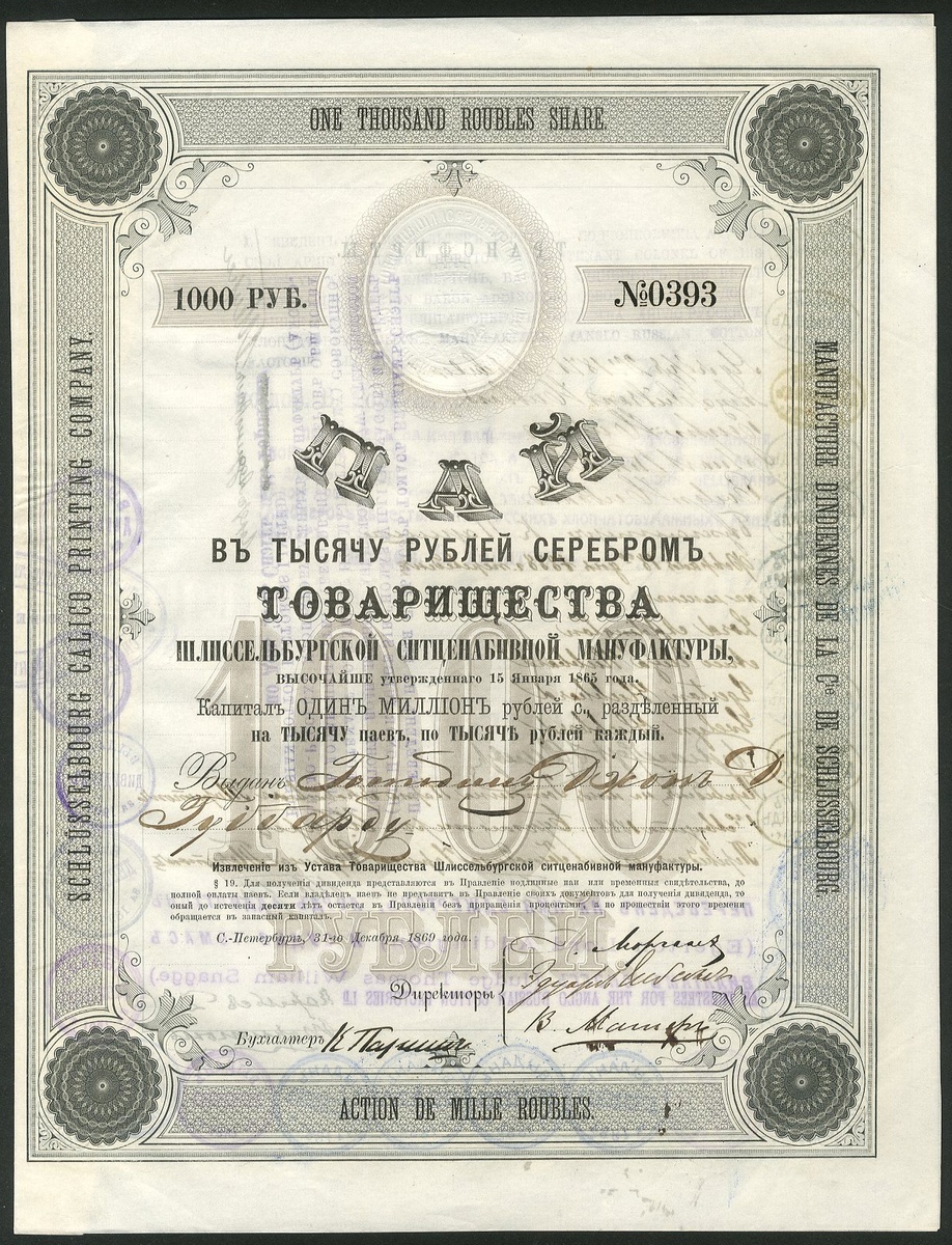 Russia: Schlusselbourg Calico Printing Company, 1000 rouble share, 1869, #0393, 4 pages, inside shows dividends paid until 1915/16, also shows ownership of Anglo-Russian Cotton Factories with signature of Evelyn Hubbard. Owned and controlled by the English Anglo-Russian Cotton Factories Ltd. And the Hubbard family. William Hubbard settled in St.Petersburg in 1769 and some years later was a member of the giant Russia Company. He and his sons carried on a general trading business but in the 1840's built a large cotton spinning and weaving factory in the Alexandroff district. A company was formed in 1851 which was very successful operating over 1200 looms during the Crimean War. In 1866 the Hubbards bought the derelict Schlusselburg Calico Printing Works and re-equipped it with modern machinery and then acquired the Spassky Mill which had over 800 employees in the 1870's. John Hubbard, head of the firm, was created Baron Addington in 1887 and was also a Governor of the Bank of England. Evelyn was also a director of the Bank of England. EF and scarce.