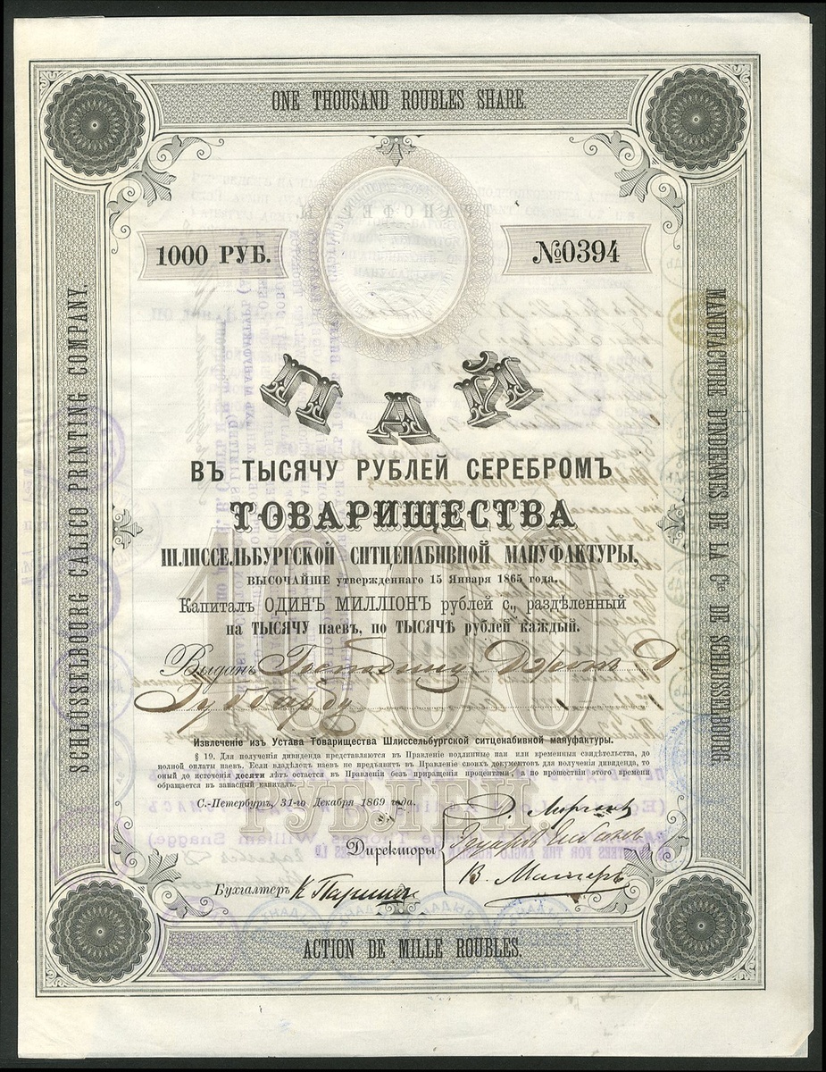Russia: Schlusselbourg Calico Printing Company, 1000 rouble share, 1869, #0394, 4 pages, inside shows dividends paid until 1915/16, also shows ownership of Anglo-Russian Cotton Factories with signature of Evelyn Hubbard. Owned and controlled by the English Anglo-Russian Cotton Factories Ltd. And the Hubbard family. William Hubbard settled in St.Petersburg in 1769 and some years later was a member of the giant Russia Company. He and his sons carried on a general trading business but in the 1840's built a large cotton spinning and weaving factory in the Alexandroff district. A company was formed in 1851 which was very successful operating over 1200 looms during the Crimean War. In 1866 the Hubbards bought the derelict Schlusselburg Calico Printing Works and re-equipped it with modern machinery and then acquired the Spassky Mill which had over 800 employees in the 1870's. John Hubbard, head of the firm, was created Baron Addington in 1887 and was also a Governor of the Bank of England. Evelyn was also a director of the Bank of England. EF and scarce.