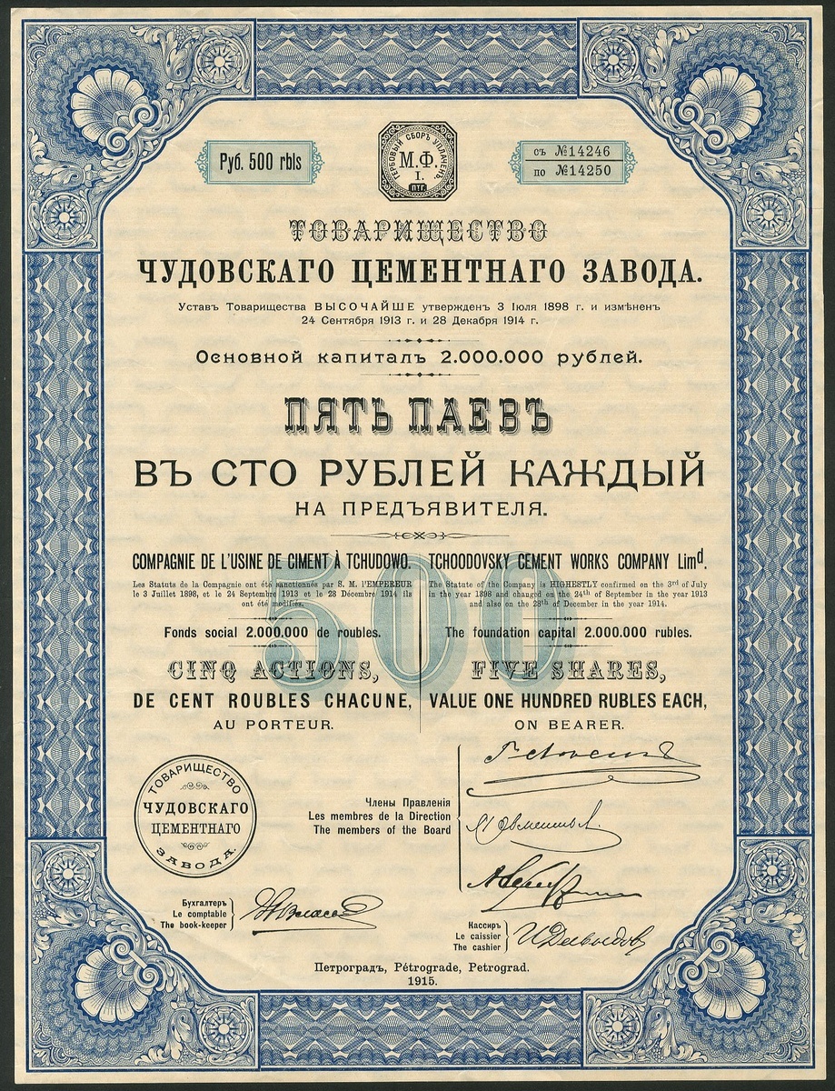 Russia: Tchoodovsky Cement Works Company Ltd., 5 shares of 100 roubles, Petrograd 1915, #14246-50, ornate border, blue, text in Russian, French and English, lacks coupons. Trimmed edges but otherwise EF.