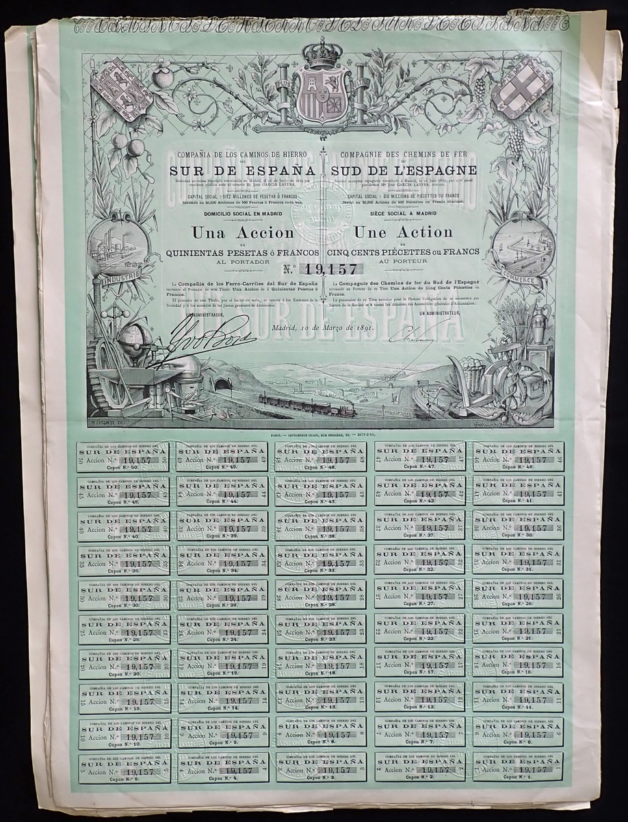 Spain: Compañia de los Caminhos de Hierro del Sur de España, a small group of 15 certificates for 1 share of 500 pesetas, Madrid 1891, very pretty piece with coats of arms at top, railway vignette at bottom, black with green underprint, with all coupons. The company owned lines in Linares and Almeria. Most are EF (15).