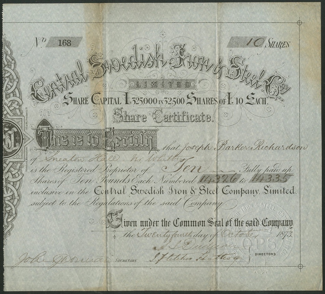 Sweden: Central Swedish Iron & Steel Co. Ltd., £10 shares, 1873, #168, ornate text, black. Sweden was one of the main producers of fine steel in the 19th century and this company manufactured Bessemer steel rails for export to the U.S.A. for railroad building. Advertised in Poor's Manual of Railroads for several years. Registered in England, the company owned the Persberg and other mines. Two folds otherwise VF and rare.