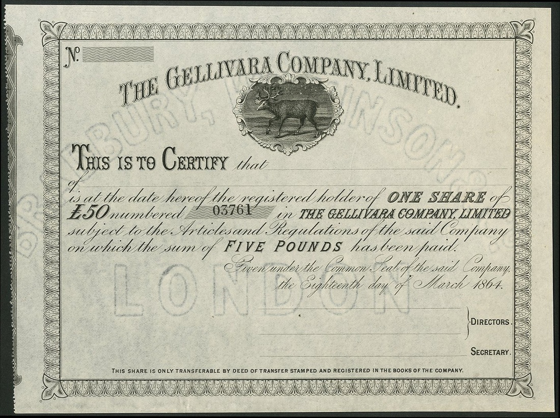Sweden: Gellivara Company Limited, an unissued certificate for 1 share of £50, 1864, #3761, vignette of reindeer, black, printed by Bradbury, Wilkinson and found in the archive so maybe held as a specimen. An iron ore mine in Northern Sweden, reconstructed as the New Gellivara Company and then taken over by a Swedish Company - Gellivara Aktiebolag in 1882. EF.