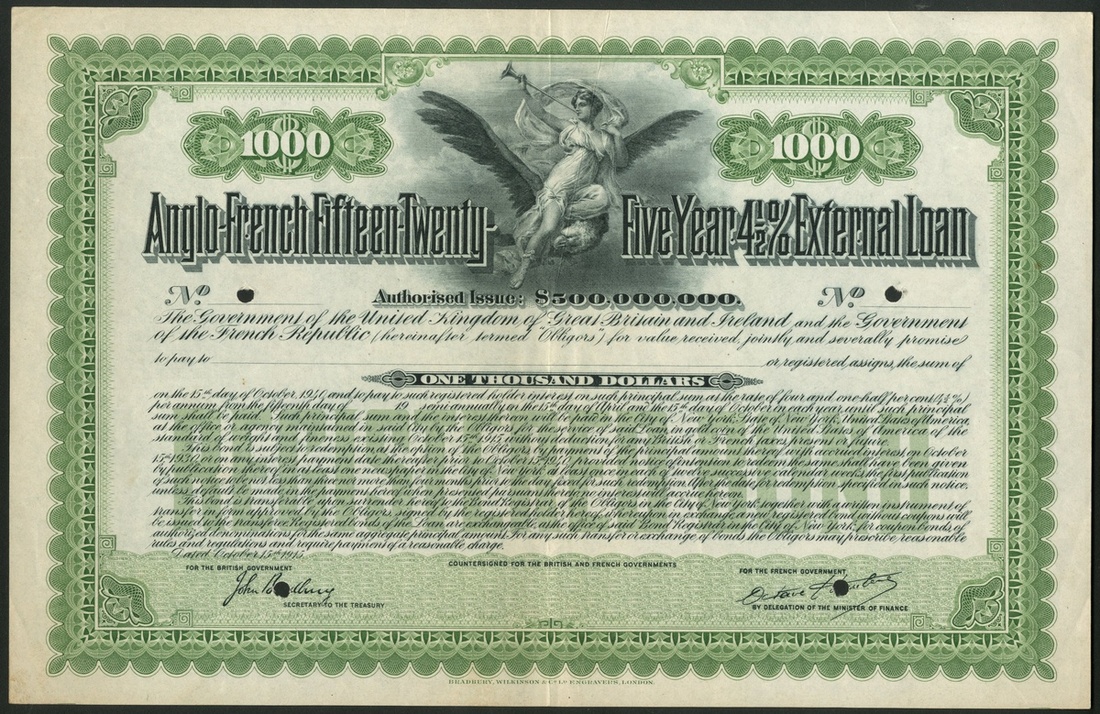 Great Britain: Anglo-French 15-25 Year 4½% External Loan, 1915, a specimen registered bond for $1000 from the American Bank Note Co. archive, facsimile signature of John Bradbury as secretary to the Treasury, allegorical female seated on bald eagle, ornate border, green and black, small hole cancels. No issued examples seen.