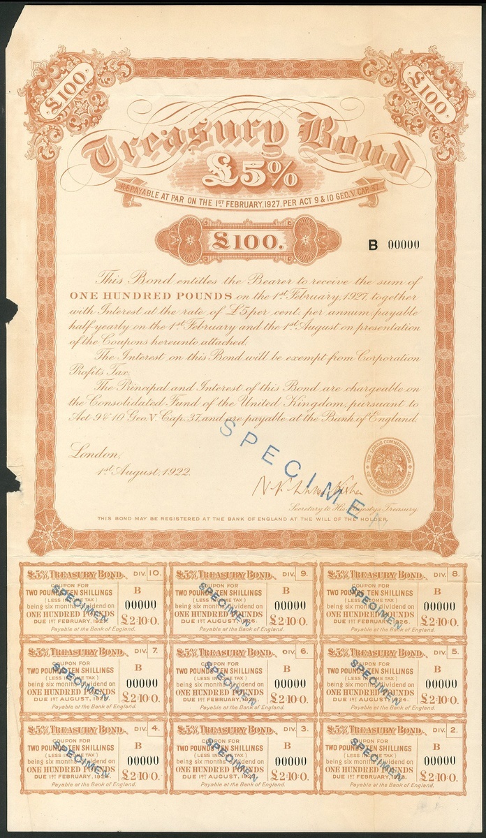 Great Britain: 1922 (August 1st), 5% Treasury Bond, £100, a specimen certificate numbered B00000 and overprinted