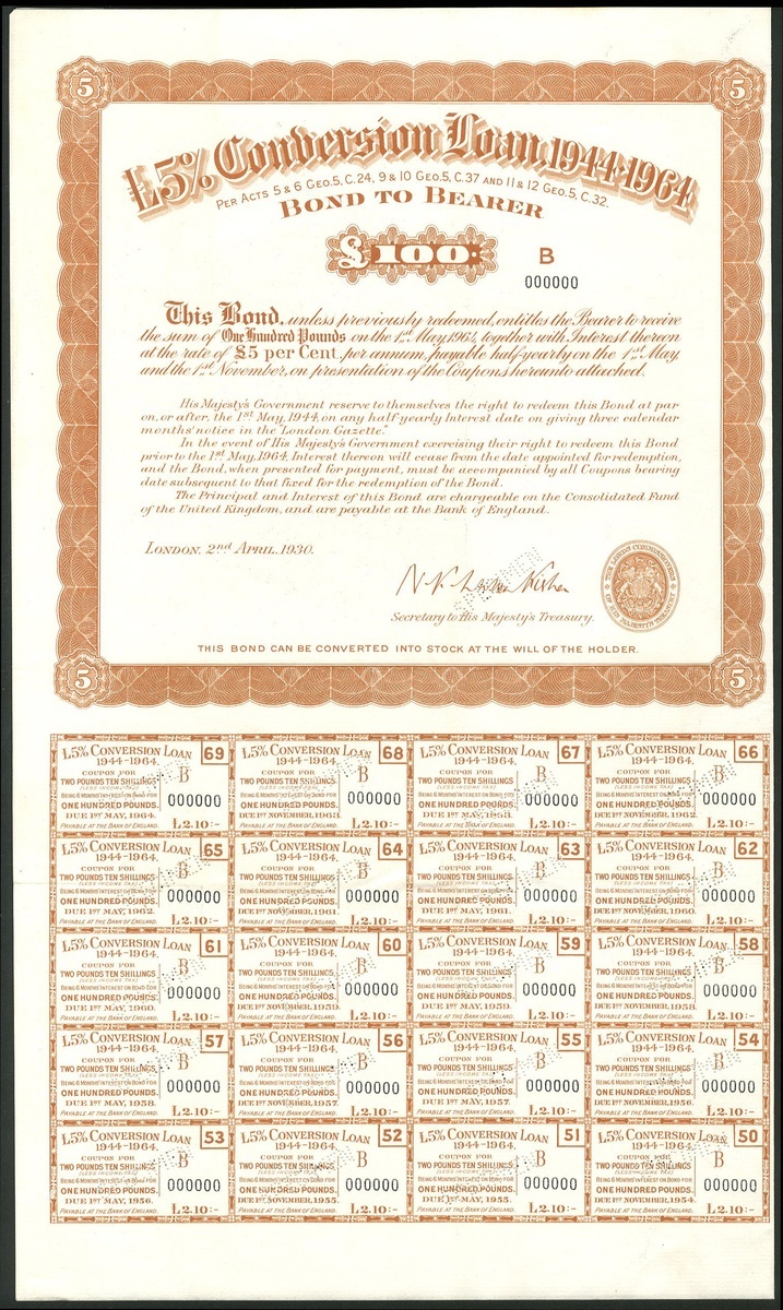 Great Britain: 1930 (2nd April) 5% Conversion Loan, a specimen bond for £100, #B000000, with facsimile signature of N.K.Warren Fisher, brown, with all coupons, perforated SPECIMEN. nly this specimen is known to exist. No issued or cancelled examples have been seen. VF-EF and extremely rare [R12].