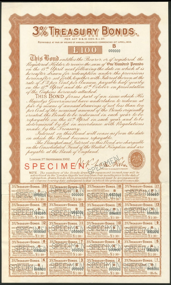 Great Britain: 1932 (1st September) 3% Treasury Bond, a specimen bond for £100, #B000000, with facsimile signature of N.K.Warren Fisher, brown, with all coupons, stamped and perforated SPECIMEN. Only this specimen is known to exist. No issued or cancelled examples have been seen. VF-EF and extremely rare [R12].