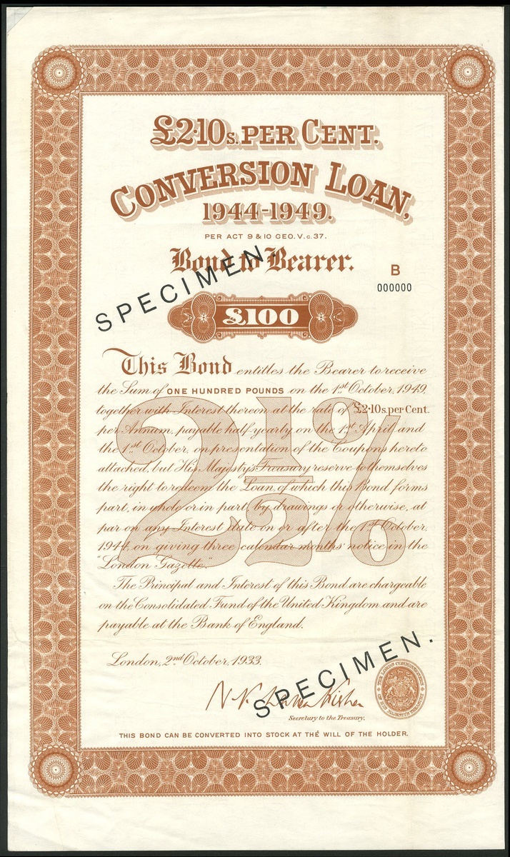 Great Britain: 1933 (2nd October) 2½% Conversion Loan, a specimen bond for £100, #B000000, with facsimile signature of N.K.Warren Fisher as Secretary of the Treasury, brown, with all coupons, stamped SPECIMEN. Only this specimen is known to exist. No issued or cancelled examples have been seen. VF-EF and extremely rare [R12].