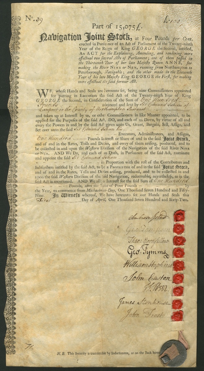 Great Britain: River Nene Navigation Joint Stock, certificate for £100 at 4% entitling the holder to a share in the Joint Stock and a share in all 'Rates, Tolls and Duties' in the Western Division of the Navigation, 1762, #39, signed by nine Commissioners with wax seals, hanging lead seal attached at bottom right, black printing on vellum. The navigable part of the River Nene extends from the Grand Union Canal, near Northampton to the Wash near Peterborough, a total of 88 miles and now has 38 locks. Although parts of the river were made navigable by acts of 1724 the main work was not undertaken until the act of 1756. The Navigation was opened in 1761. The navigation was in a state of disrepair by the 1920's and major works were undertaken in the 1930's.Yelowed overall but VF and rare [R9]