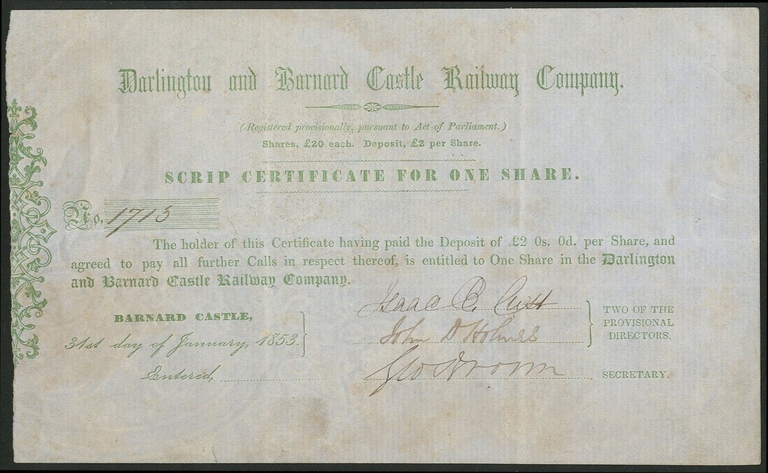 Great Britain: Darlington and Barnard Castle Railway Company, scrip certificate for one share, 1853, #1715, green, signed by provisional directors. Issued prior to the Act of Incorporation. Incorporated on 3rd July 1854. A 15¼ mile line between the towns also connecting with the Stockton and Darlington Railway. It opened in 1856, and became amalgamated (along with others) with the Stockton & Darlington Railway who issued preferential stock in lieu of existing shares, to pay all debts. VF and rare.