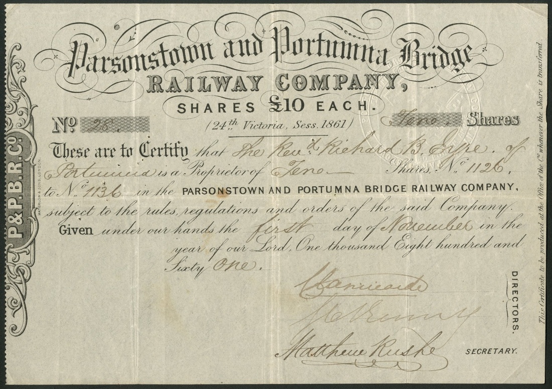 Ireland: Parsonstown and Portumna Bridge Railway Company, £10 shares, 186[1], #28, signed by the Marquess of Clanricarde as director. Embossed seal top right, black, together with a related deposit payment receipt, 186[1]. Opened in 1868 but closed in 1878 and the track, buildings and other equipment were removed/stolen by local people and creditors. F-VF and very rare, we believe only 2 examples known, this and serial number 65 sold on Ebay in 2018. Ex Sotheby's 1980, Spink 2014.