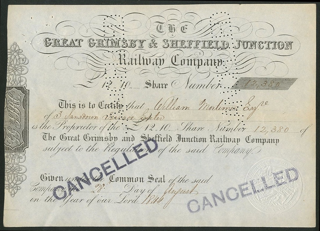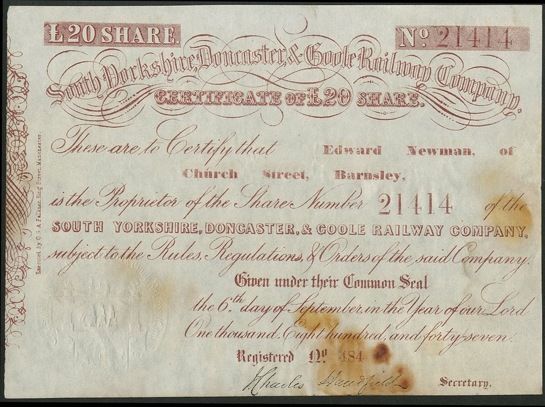 Great Britain: A pair of Yorkshire Railways, comprising South Yorkshire, Doncaster & Goole Railway Company, £20 share, 1847, #21414, red-brown with attractive ornate seal, and, Great Grimsby & Sheffield Junction Railway Company, £12 10s share, [1846], black, stamped cancelled. The first with some staining, VF (2).