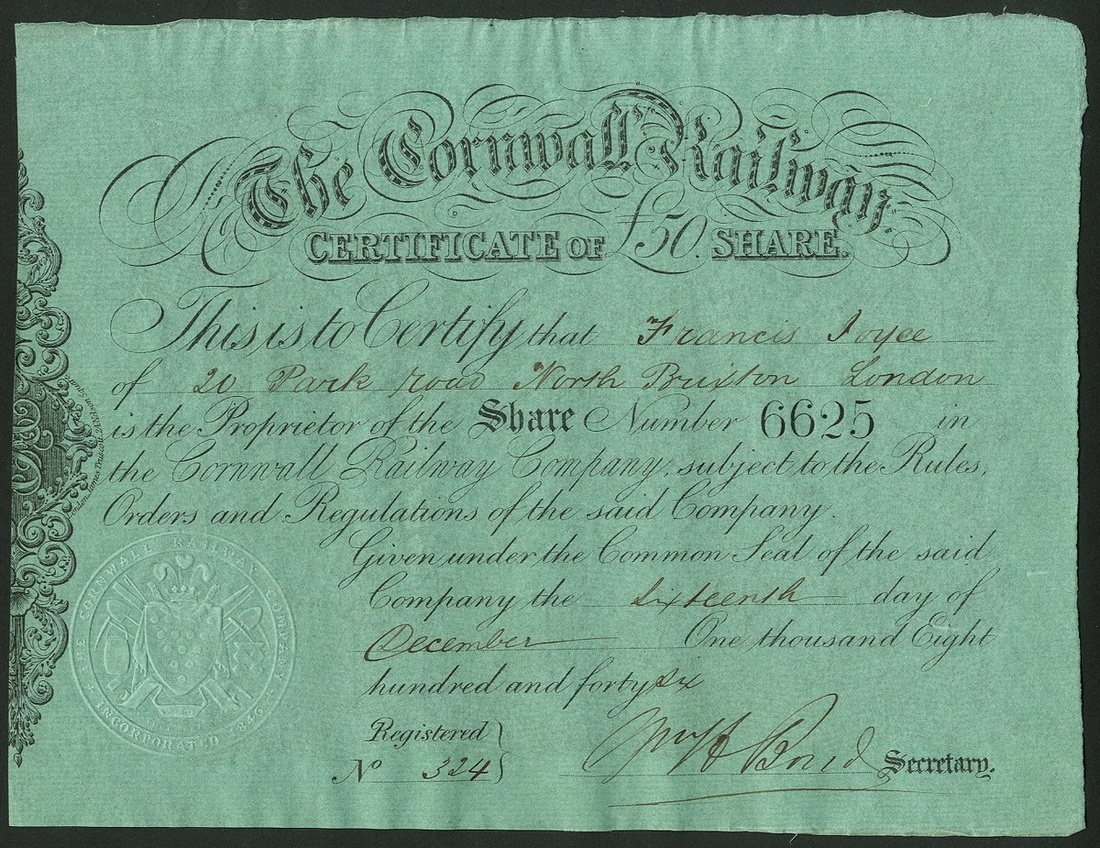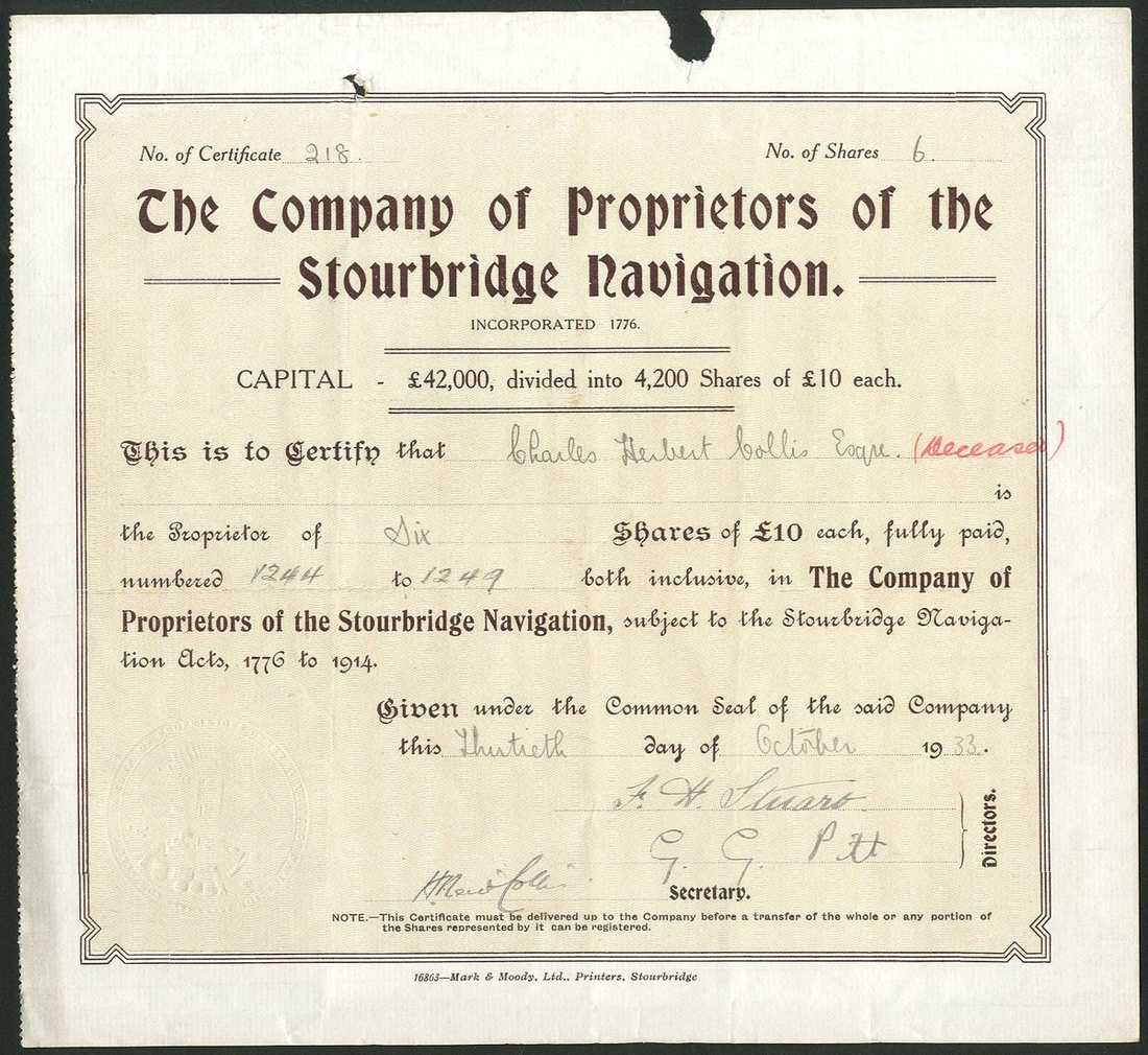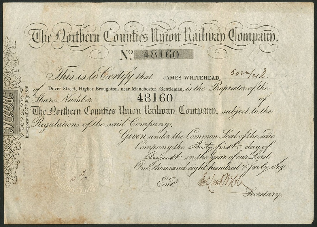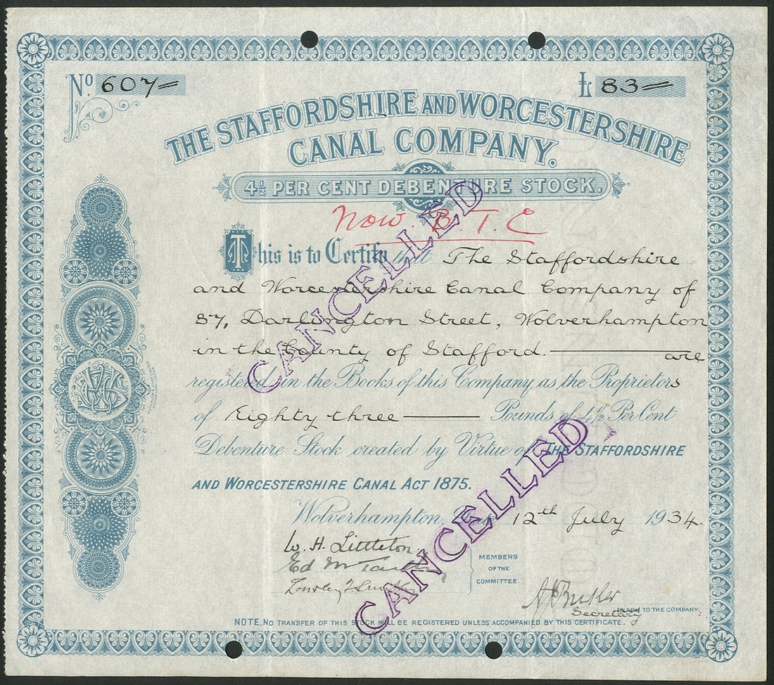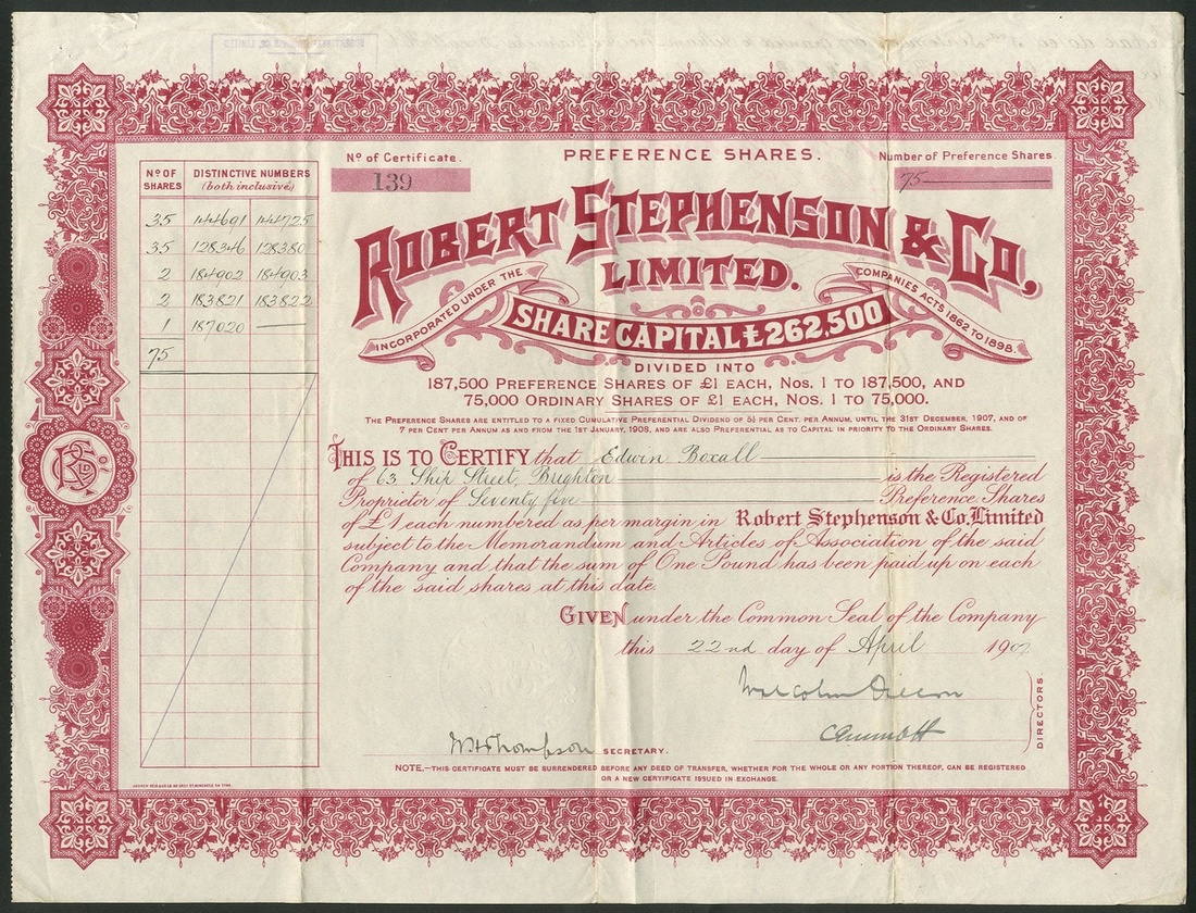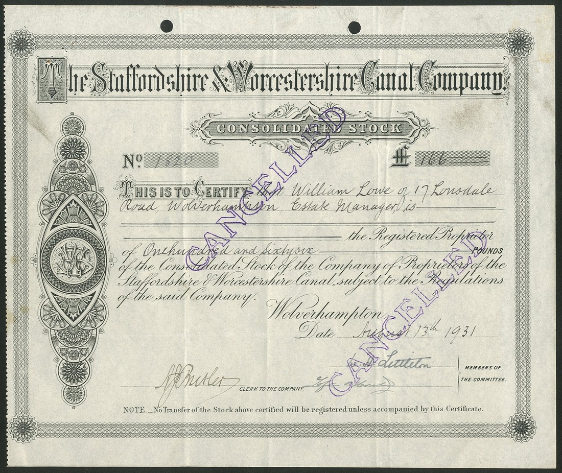 Great Britain: A small collection of railways and canals, comprising Cornwall Railway, £50 share, 184[6]; Easton & Church Hope Railway Co., £20 preference shares, 188[91], cancelled; Northen Counties Union Railway Co., 18[46]; Robert Stephenson & Co. Ltd., 19[07]; Staffordshire & Worcestershire Canal Company, 2 types, [1931] and 19[34], and, Stourbridge Navigation, 19[33]. The last 3 with filing holes and cancelled, F-VF (7).