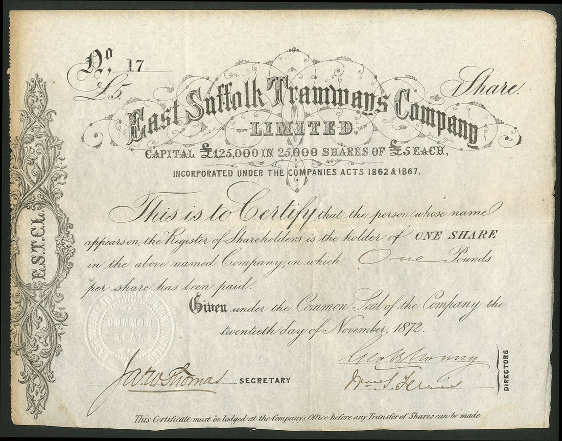 Great Britain: East Suffolk Tramways Company Limited, 1 share of £5, 1872, #17, scrollwork left, black. A horse tramway from Yarmouth to Gorleston, name changed to Yarmouth and Gorleston Tramways Company in 1878 and taken over by British Electric Traction Company in 1900. VF and rare.