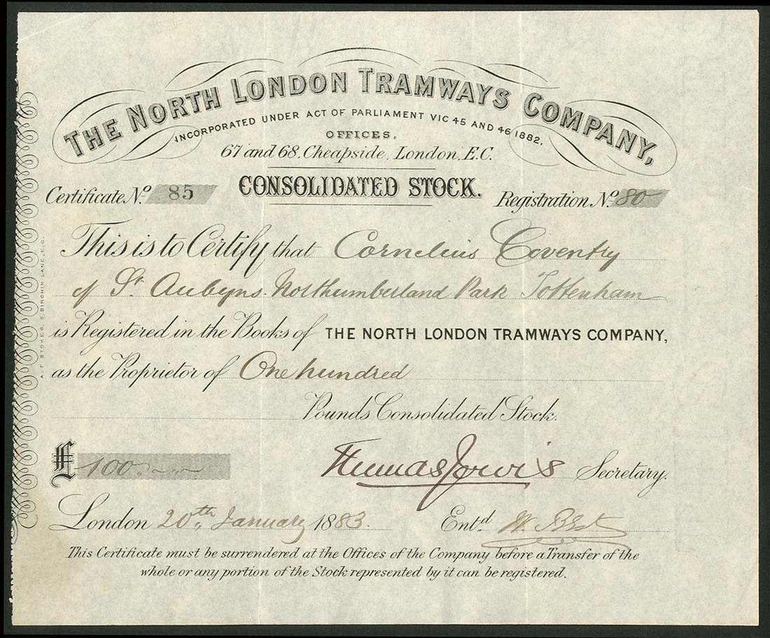 Great Britain: North London Tramways Company, consolidated stock certificate, 18[83], #85, scrollwork at left, black. London's first steam tram operator running 25 trams between Stamford Hill and Ponders End and Finsbury Park. VF and rare.