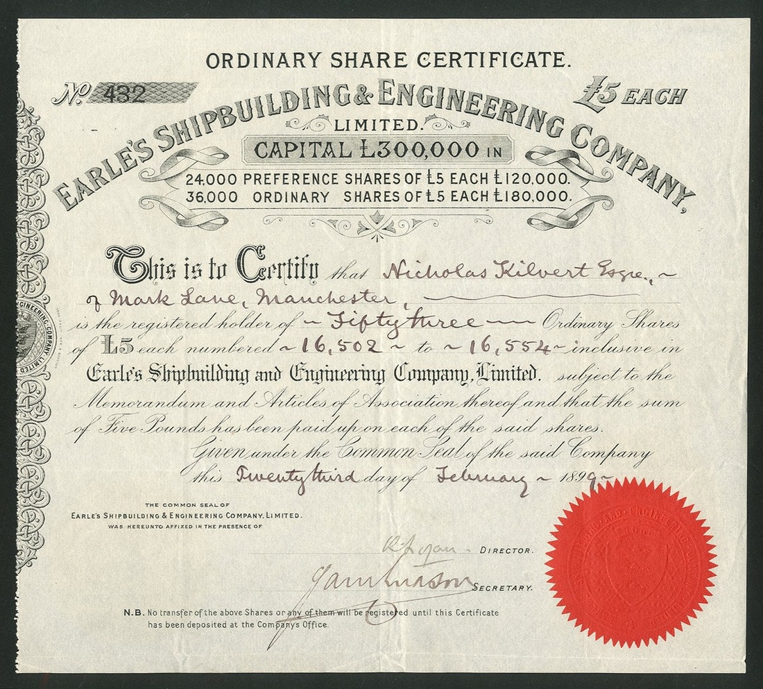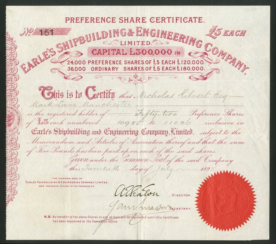 Great Britain: Earle's Shipbuilding & Engineering Co. Ltd., pair of certificates for £5 ordinary shares, 189[9], #432, and £5 preference shares, 189[8], #151, attractive printing, black and pink respectively, with red paper seals. Established in Hull in 1845 by Charles and William Earle, incorporated with a limited liability in 1871. Built the SS Bessemer, Sir Henry Bessemer's experimental swinging-cabin paddle steamer, which made its maiden (and only) public voyage in 1875. After voluntary liquidation in 1900 due to the death of one partner and illness of the other, a new company bearing the same name was incorporated in 1901 controlled by the Wilson line for whom the company had built many ships. The company finally went into liquidation in 1933. VF and scarce.