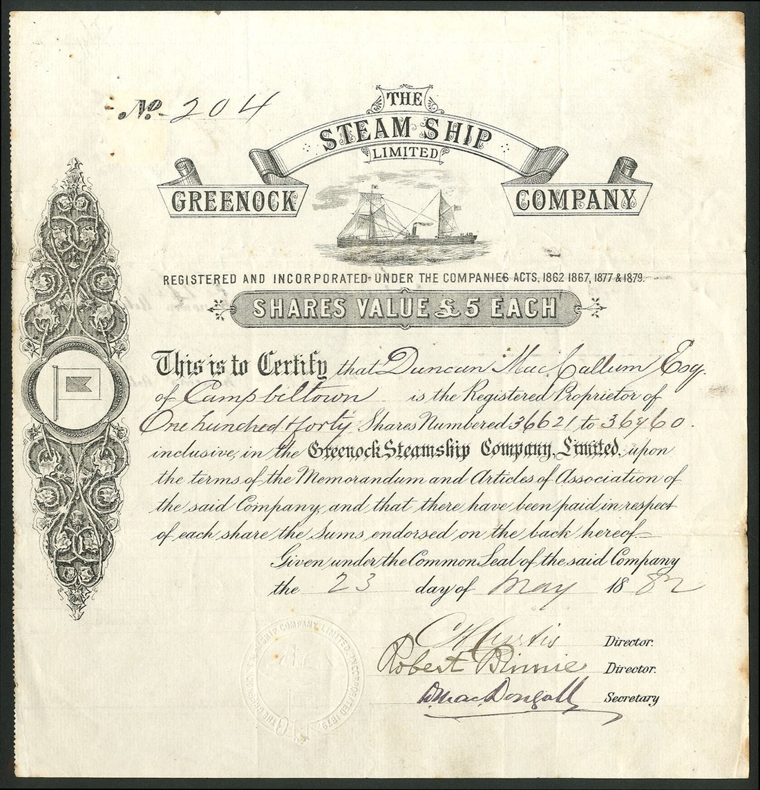 Great Britain: Greenock Steamship Co. Ltd., £5 shares, 18[82], #204, steam assisted sailing ship, company flag at left, black. Formed in 1879 to operate a fleet of tramp steamers between Scotland and the Gulf of Suez and the Gulf of Mexcico. Amalgamated to form the Gulf Line in 1899. VF.
