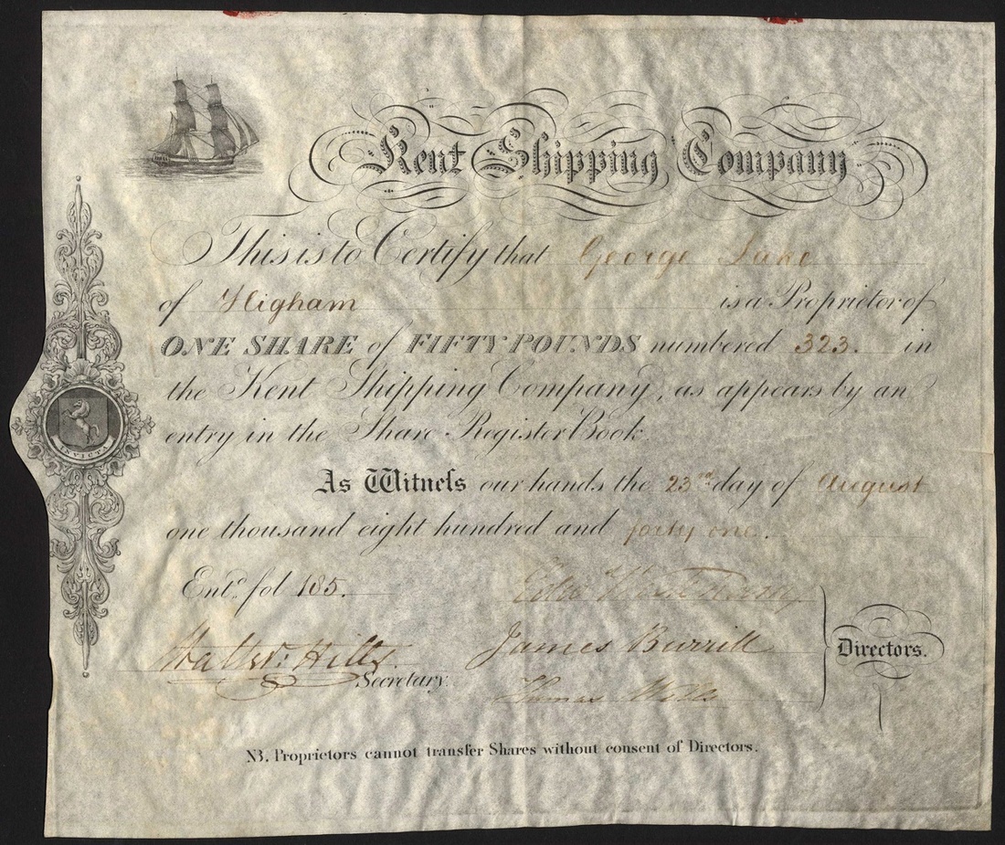 Great Britain: Kent Shipping Company, £50 share, 18[41], #323, small sailing ship top left, scrollwork with Kentish arms at left, black printing, on vellum. Somewhat crinkled GVF and rare.