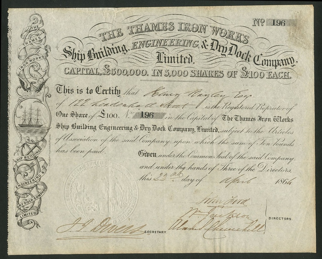 Great Britain: Thames Iron Works Ship Building, Engineering & Dry Dock Co. Ltd., £100 shares, 186[4], #196, sailing ship at left, black. The company acquired the yard at Blackwall, London from the bankrupt Charles Mare supported by Peter Rolt, his father-in-law and Lord Alan Spencer-Churchill, who signs this certioficate as director. The new company was the largest shipbuilder on the Thames; it built the largest iron warship in the world - HMS Warrier - in 1863, followed by vessels by many navies around the world. Title changed in 1899 to Thames Iron Works, Shipbuilding & Engineering Co after the acquisition of engine builder John Penn. Thames Ironworks Football Club was formed in 1895 but the name was changed in 1900 to West Ham United Football Club allowing them to employ professional players. Motor cars were also produced for a few years in the early 1900's. Lord Alan Spencer-Churchill, 3rd son of the Earl of Marlborough, great uncle of Sir Winston Churchill. VF.