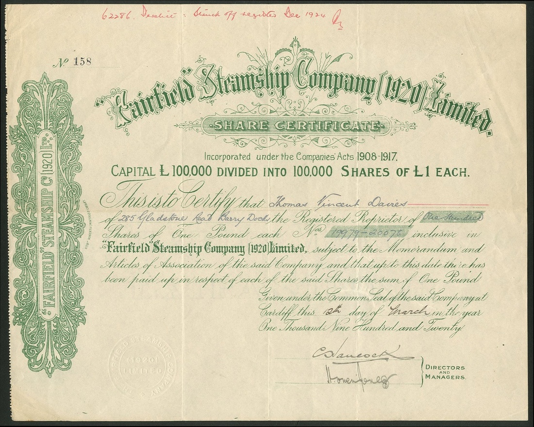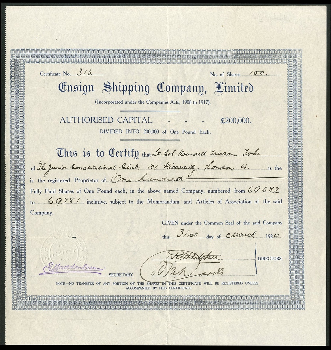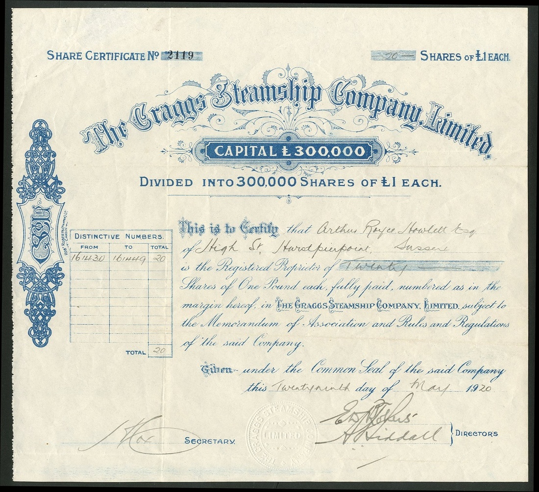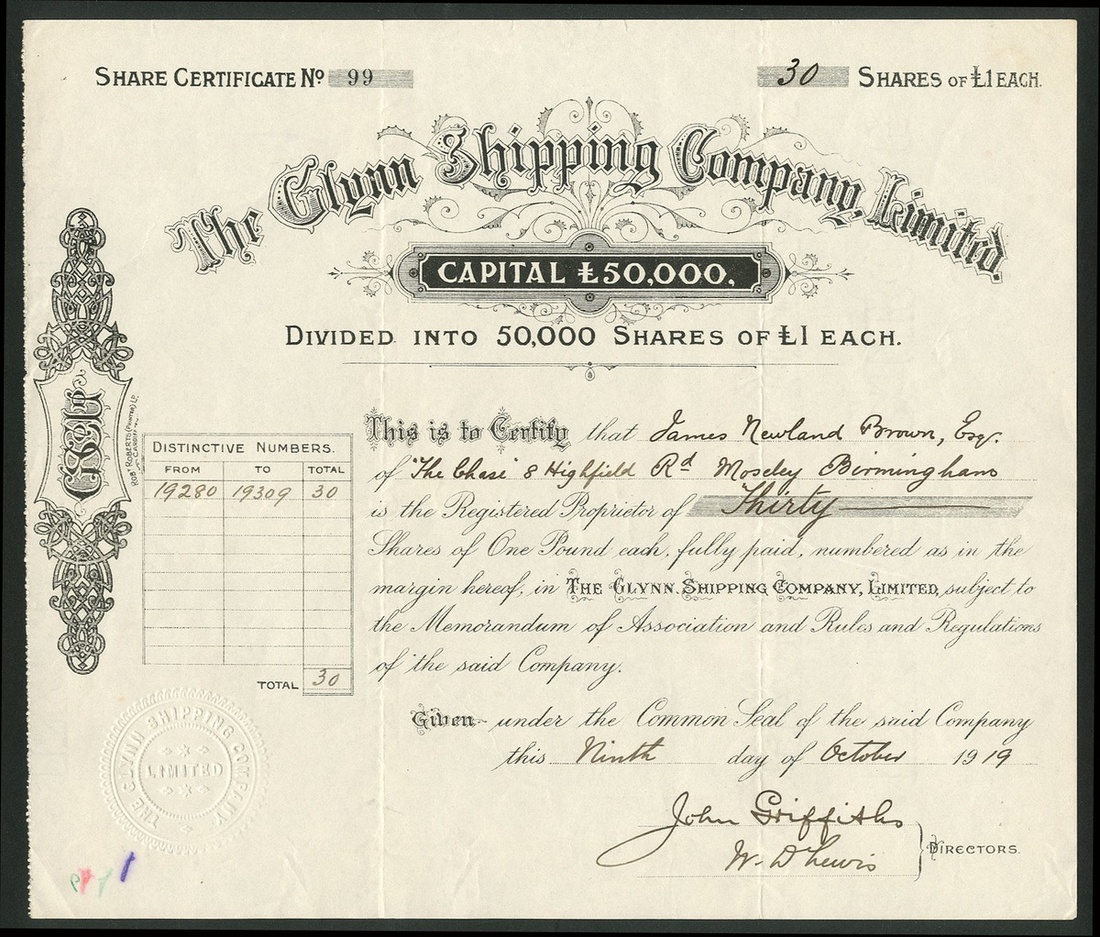 Great Britain: A good collection of post WWI steamship companies, comprising Summerfield Steamship Co. Ltd., 19[19]; Rumney Steamship Co. Ltd., 19[19], vignette of steamer; Devon Shipping Co. Ltd., 192[0]; Craggs Steamship Co. Ltd., 19[20]; Glynn Shipping Co. Ltd., 19[19]; "Fairfield" Steamship Company (1920) Limited, 1920; Farley Steam Navigation Co. Ltd., 19[20]; Ensign Shipping Co. Ltd., 192[0], and, Care & Marquand Shipping Co. Ltd., 19[19]. Generally VF ( 9).