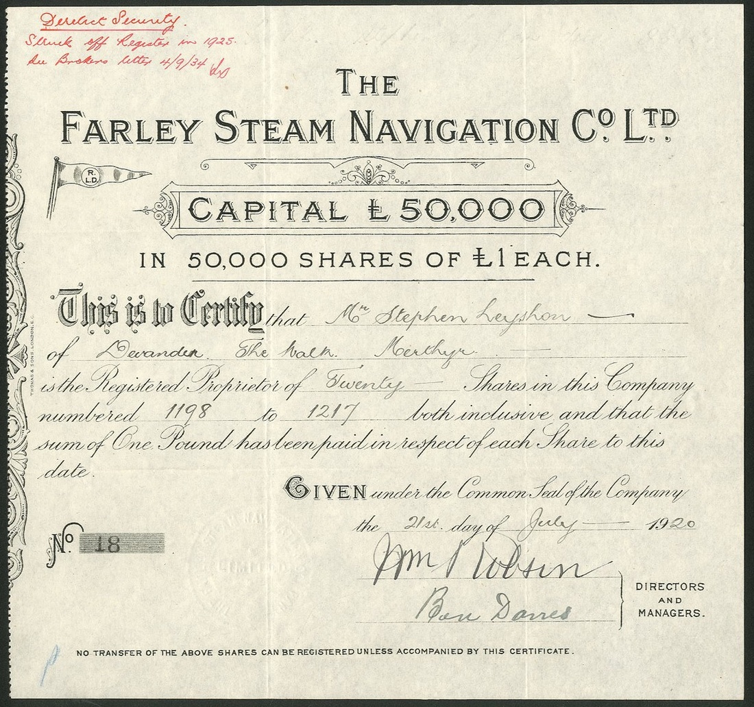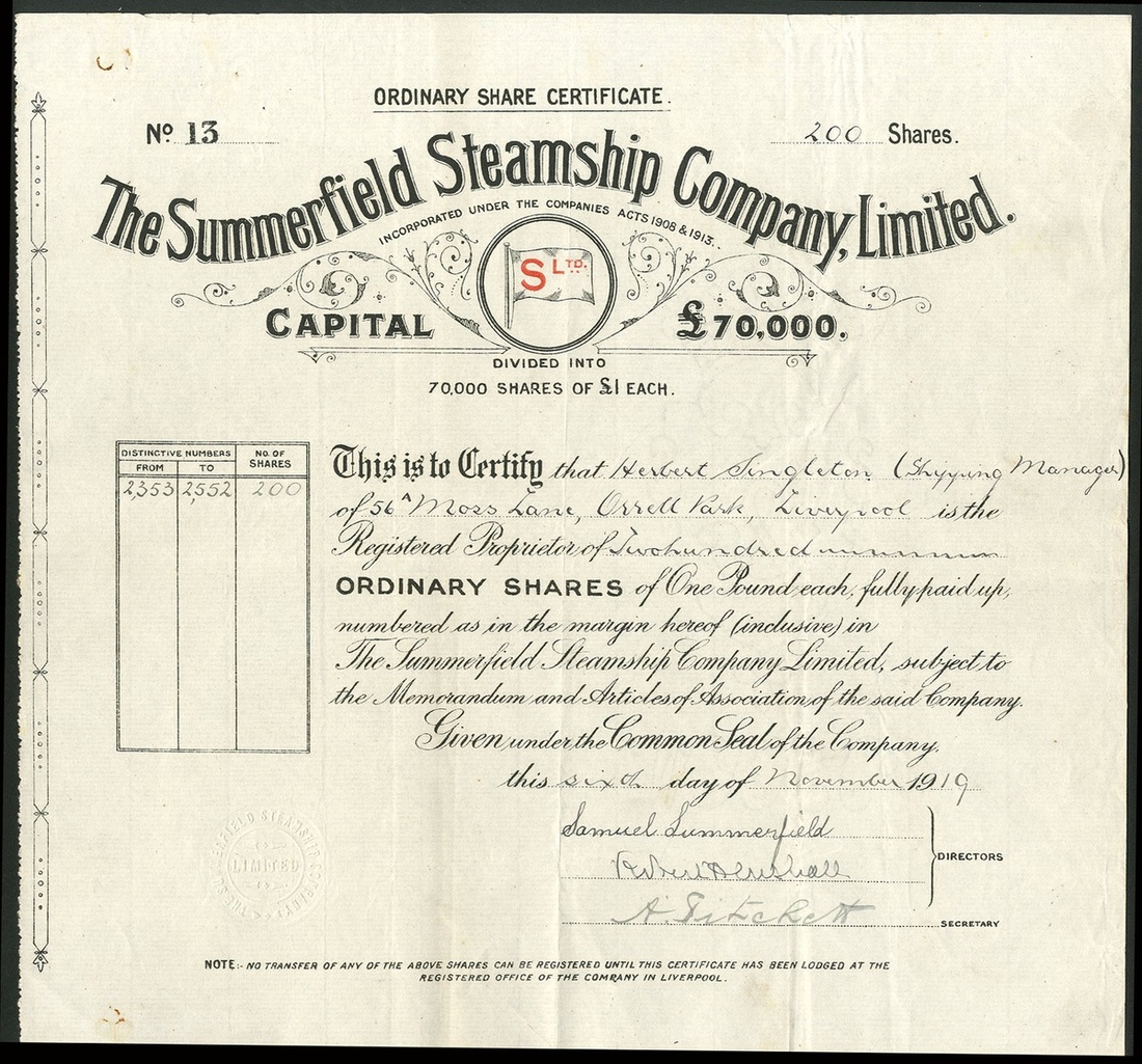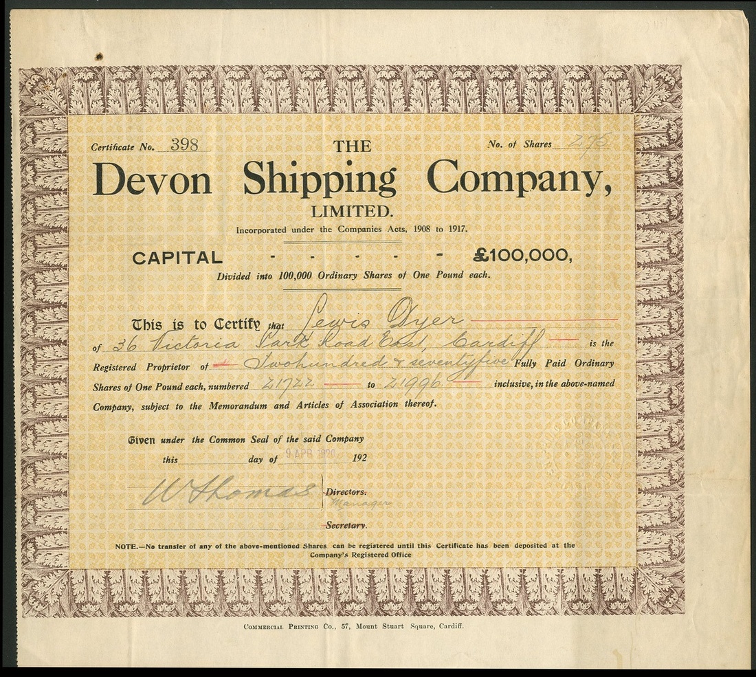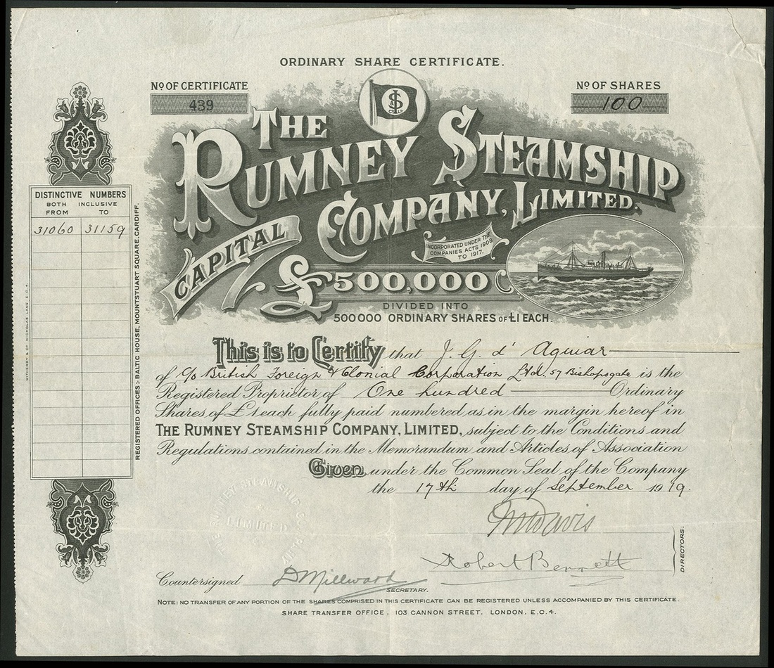 Great Britain: A good collection of post WWI steamship companies, comprising Summerfield Steamship Co. Ltd., 19[19]; Rumney Steamship Co. Ltd., 19[19], vignette of steamer; Devon Shipping Co. Ltd., 192[0]; Craggs Steamship Co. Ltd., 19[20]; Glynn Shipping Co. Ltd., 19[19]; "Fairfield" Steamship Company (1920) Limited, 1920; Farley Steam Navigation Co. Ltd., 19[20]; Ensign Shipping Co. Ltd., 192[0], and, Care & Marquand Shipping Co. Ltd., 19[19]. Generally VF ( 9).