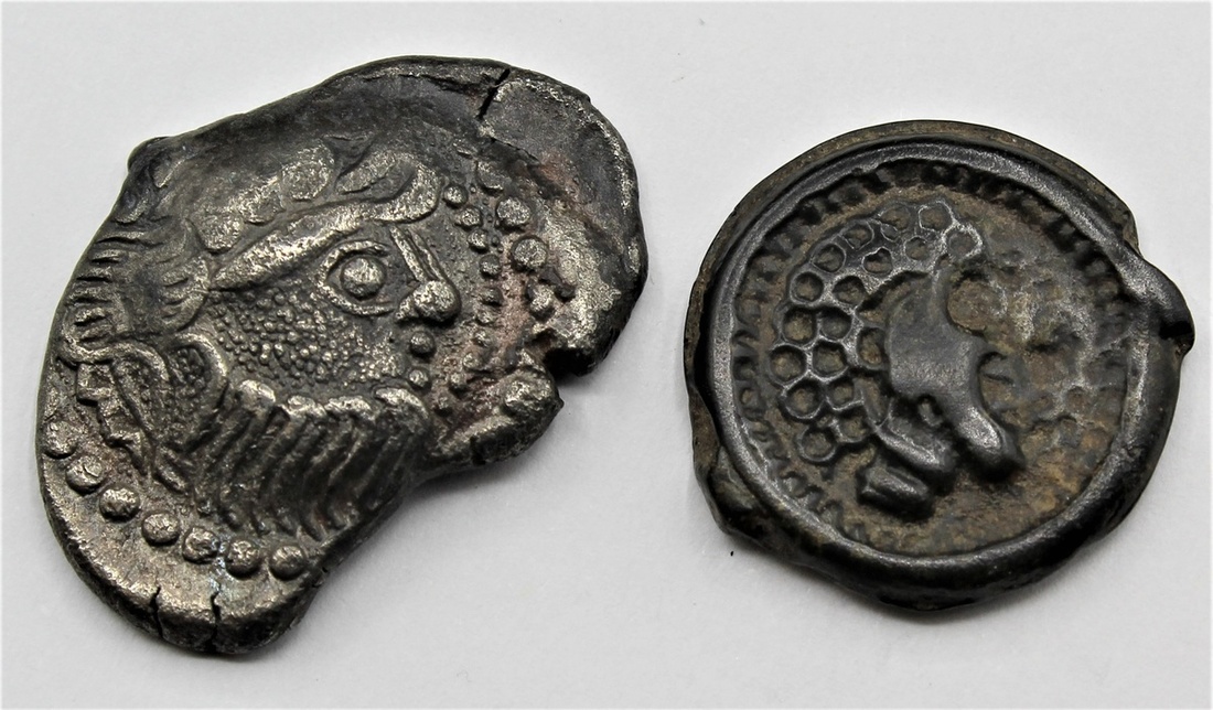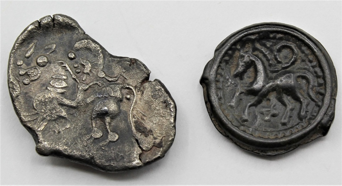Gaul, Suessiones (c. 1st Century BC), cast Potin, 5.33g, bearded bust right formed of impressed pellets, rev. horse left, motifs surround (LV 7870; Depeyrot, NC VI, 120; DT 216), about very fine; also, Northwest Gaul, Stater, 8.38g, helmeted and bearded bust right, rev. stylised horse and rider left, on an elliptical flan with some minor striking splits, otherwise almost very fine (2)