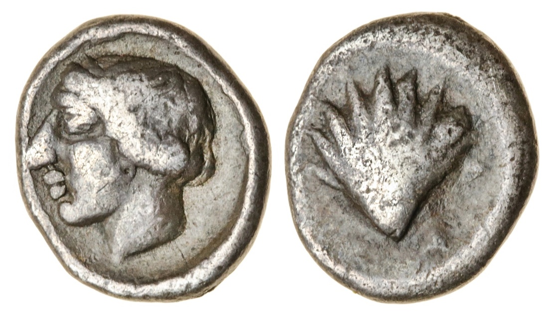 Calabria, Taras [Tarentum] (c. 475-450 BC), AR Litra or Obol, 0.75g, head of Satyr or Nymph left, rev. scallop shell (Vlasto 1158-61; SNG [ANS], 1343; SNG [München], 721), fine, rare