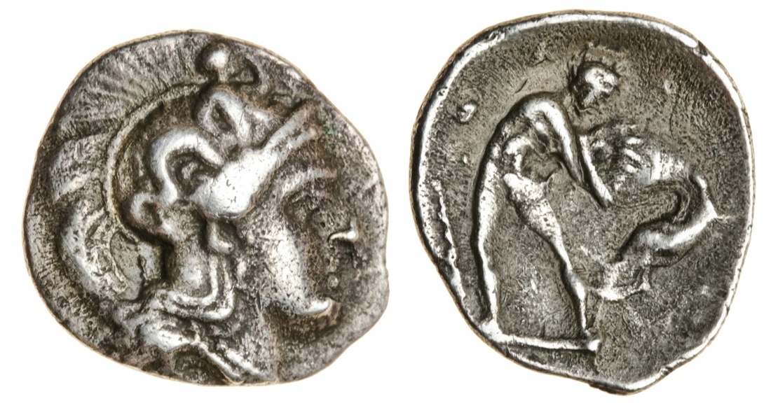 Calabria, Taras [Tarentum] (c. 380-320 BC), AR Diobol, 0.86g, helmeted head of Athena right, rev. Herakles wrestling the Nemean Lion (HN Italy 911; BMC I, 382), almost very fine