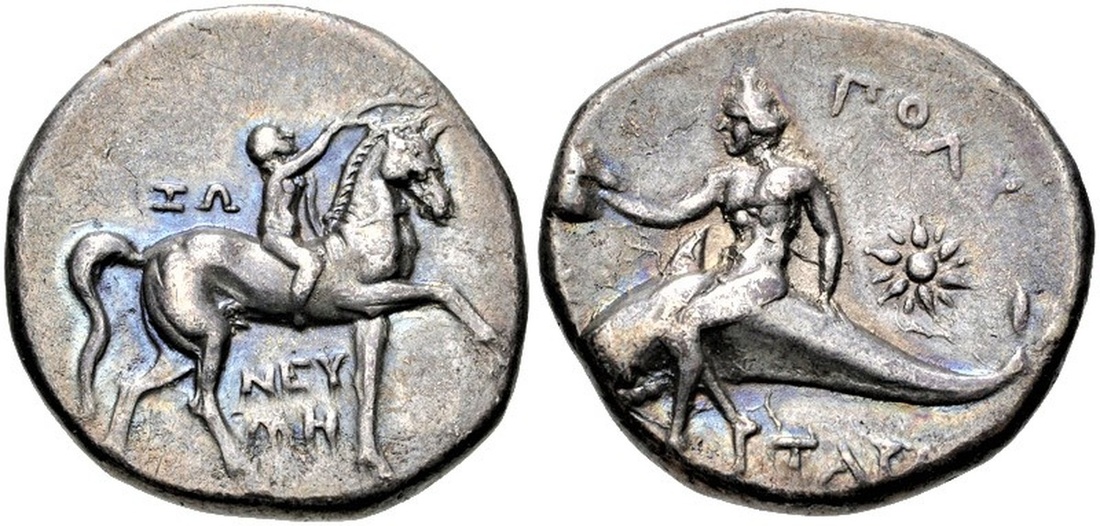 (x) Calabria, Taras [Tarentum] (c. 280-272 BC), AR Nomos, 19mm., 6.38g, 10h, Neyme-, Zo-, and Poly-, magistrates, nude youth on horseback right, crowning horse with wreath, rev. Phalanthos riding dolphin left, holding Phrygian helmet, two stars flanking, ZO behind, NEY|MH in two lines below, POAY to right (Vlasto 739-47; HN Italy 1006), attractively toned with much eye appeal, good very fine or better