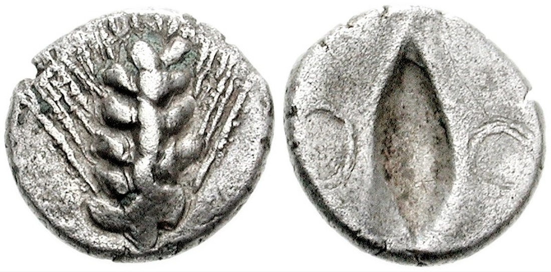 (x) Lucania, Metapontion [Metapontum] (c. 470-440 BC), AR Diobol, 0.64g, ear of barley with six grains, rev. incuse barley grain; annulets flanking (Noe 297; HN Italy 1488; cf. SNG ANS 274), very fine