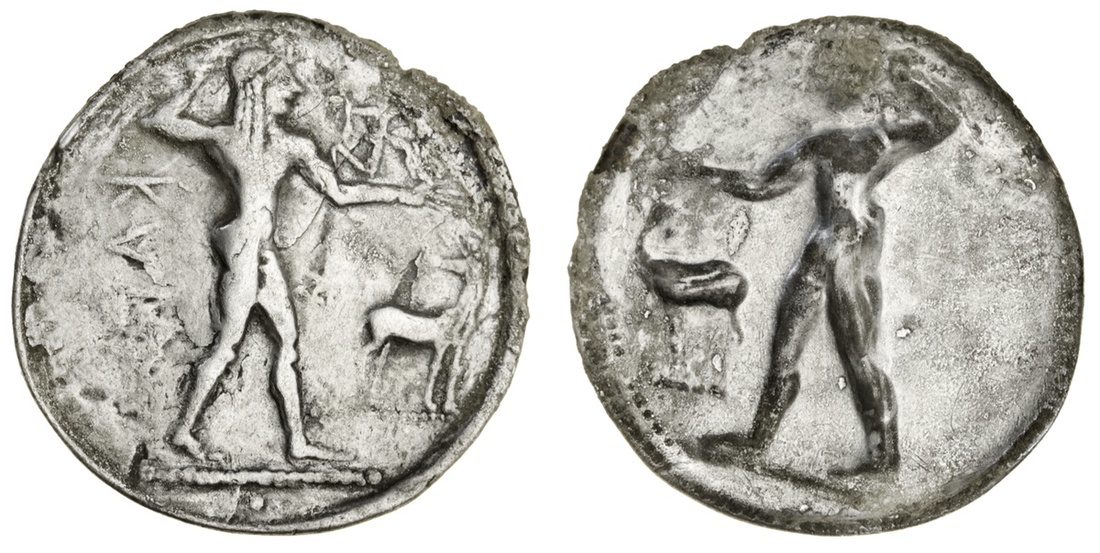 Bruttium, Kaulonia (c. 530-500 BC), AR Nomos, 7.09g, Apollo advancing right, holding branch; small daimon running right on Apollo's left arm; KAV? to left; to right, stag standing right, rev. Incuse of reverse, but no daimon (SNG ANS 145 (same dies); HN Italy 2035), some slight roughness, otherwise lightly toned, good fine, rare