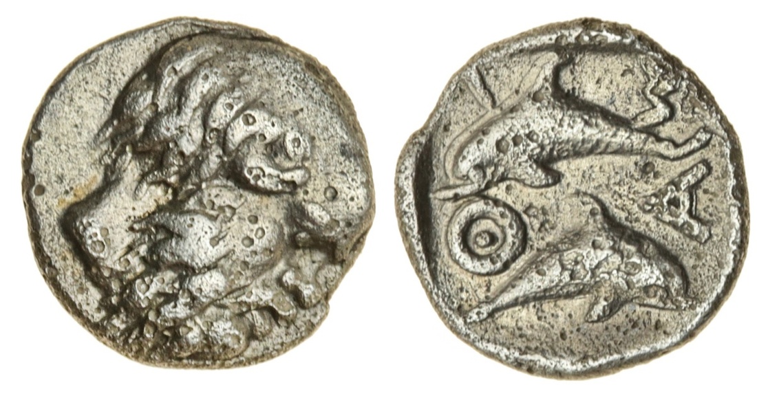Thracian Islands, Thasos (c. 411-350 BC), AR Tritemorion, 0.39g, head of bald and bearded satyr right, rev. overlapping dolphins, AOE in field (BMC 60), very fine, rare