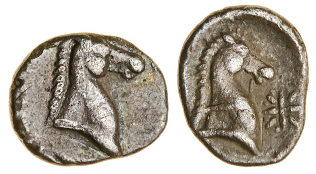 Thessaly (?), uncertain mint (c. 5th-4th Century BC), AR Obol, 0.43g, horse head right, cross over saltire motif before, rev. horse head right, good fine